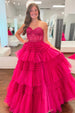 Machen Sie in diesem atemberaubenden, fuchsiafarbenen, mehrlagigen, trägerlosen A-Linien-Tüll-Ballkleid mit Applikationen eine tolle Figur. Mit trägerlosem Ausschnitt, Prinzessinnen-Taille und einzigartigem mehrlagigen Tüllrock wird es garantiert zu einem Lieblingsstück in Ihrer Garderobe. Perfekt für Abschlussbälle, Brautpartys und andere besondere Anlässe.