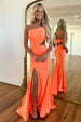 Sehen Sie umwerfend aus in diesem atemberaubenden, orangefarbenen Meerjungfrauen-Abendkleid mit Schlitz und One-Shoulder-Design. Mit seiner Meerjungfrauen-Silhouette, dem One-Shoulder-Design und dem klassischen orangefarbenen Stoff wird dieses schlichte Kleid Sie zum Gesprächsthema des Abends machen.