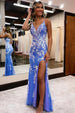 Realza tu look de noche con este vestido de fiesta de corte sirena con escote en V pronunciado, apliques de encaje y abertura. Esta clásica silueta de sirena está confeccionada en satén azul para un look elegante. Las delicadas aplicaciones de encaje le dan un toque de glamour. La abertura delantera le da más estilo y movimiento. Este vestido es perfecto para la noche de graduación de adolescentes.