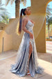 Luce espectacular con este espectacular vestido de noche largo de tul plateado con tirantes finos y abertura PSK369. Con tul plateado y falda con abertura, este vestido de fiesta es perfecto para causar una gran impresión. Elaborado con materiales de la más alta calidad, sin duda llamará la atención en tu evento especial.