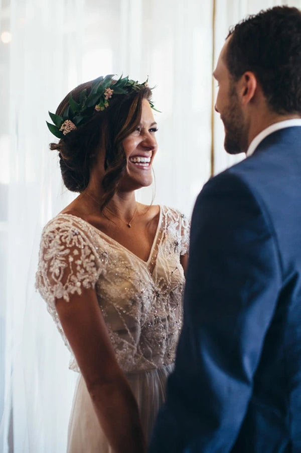 Vestidos de novia brillantes, románticos, corte A, escote en V, gasa con pedrería. MW442