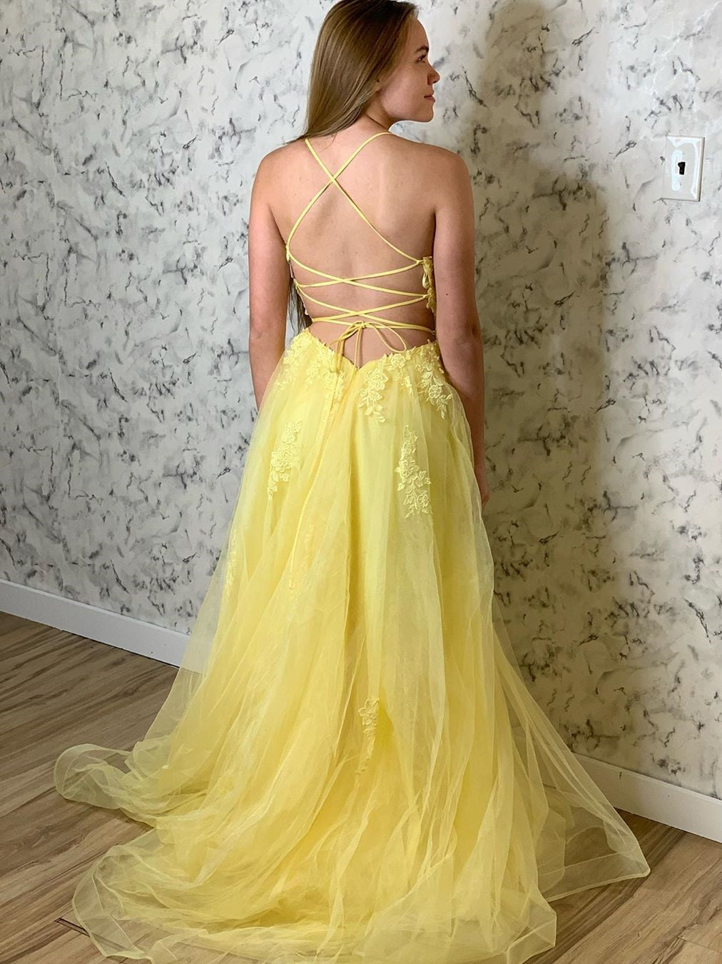 Luce como la realeza con este elegante vestido de fiesta amarillo largo de tul, corte A, con espalda descubierta y encaje. Confeccionado en tul de calidad, este vestido de fiesta está diseñado para realzar tu figura y hacerte destacar entre la multitud. El detalle de encaje en la espalda descubierta le da un toque de sofisticación clásica. Crea el look perfecto para tu día especial.