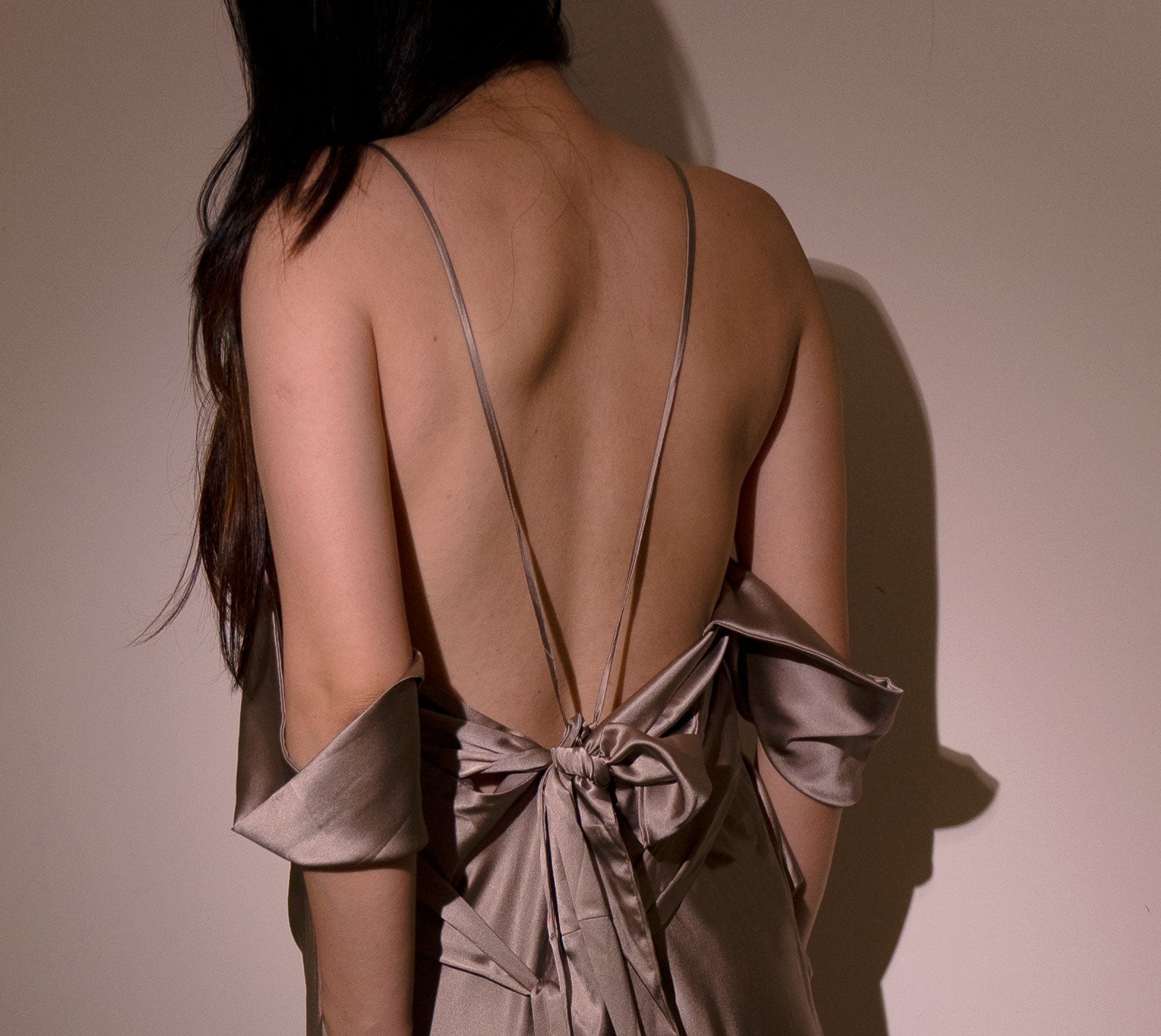Hold the measuring tape at your hollow while a friend pulls it down to the length you want your dress.