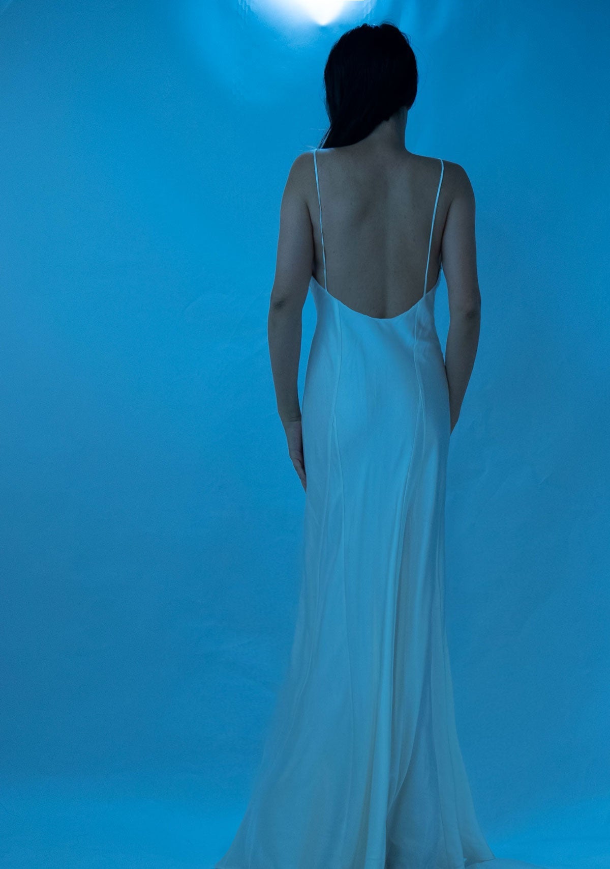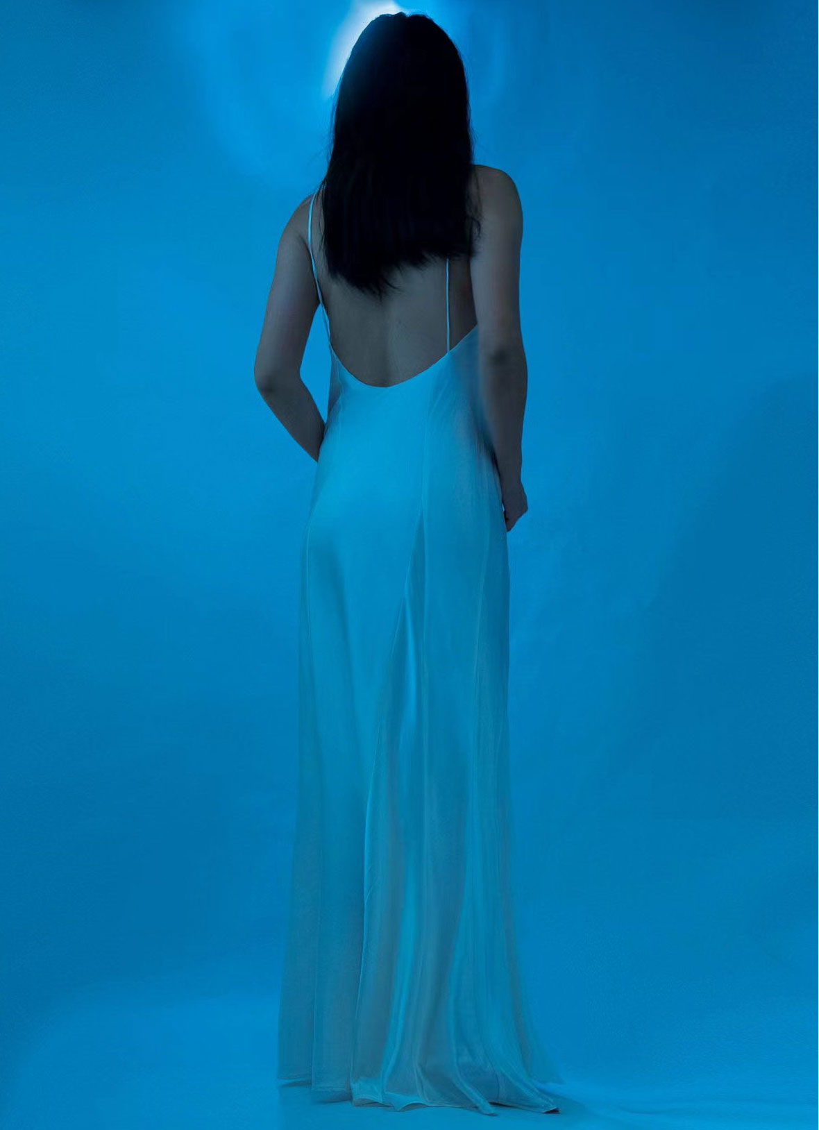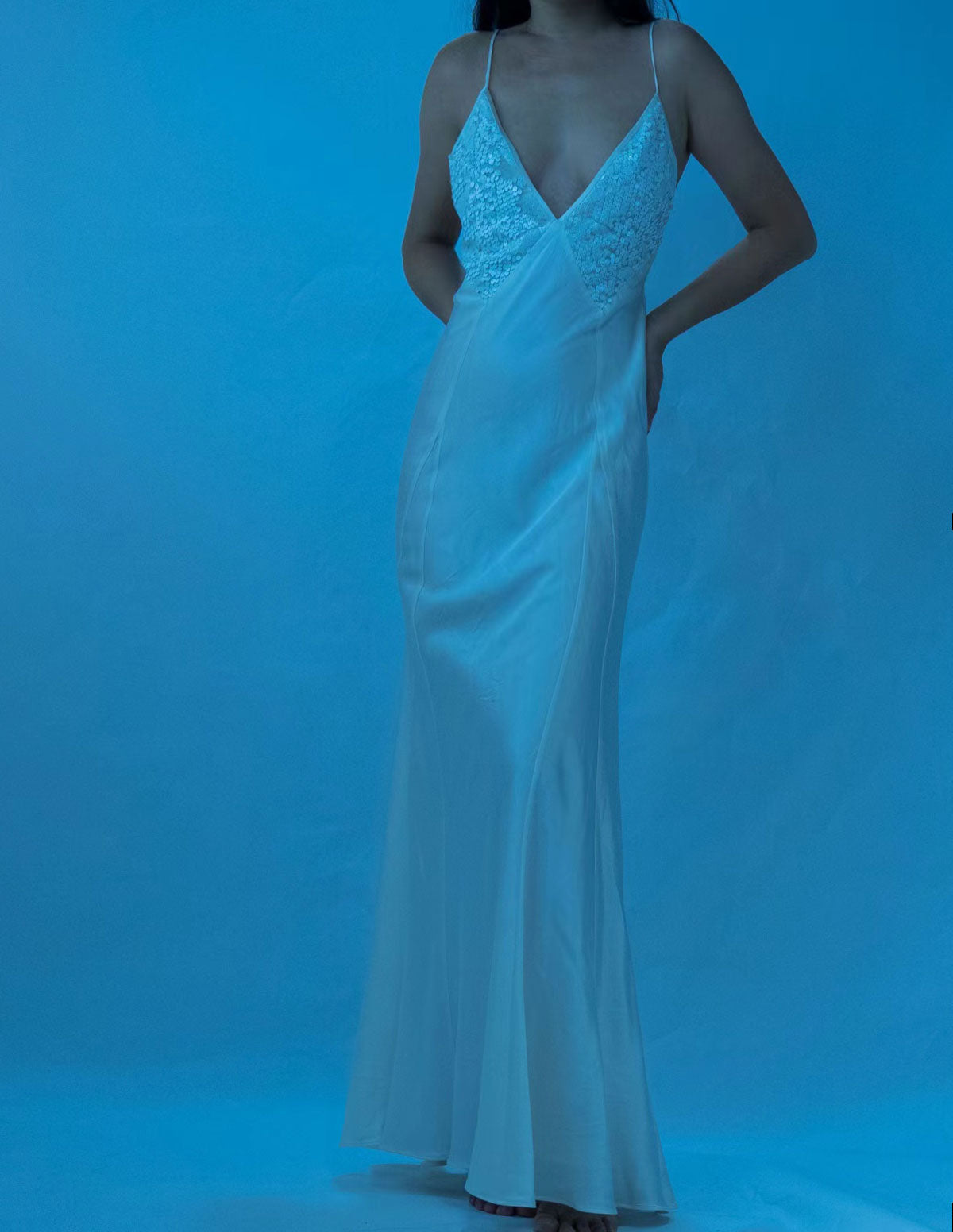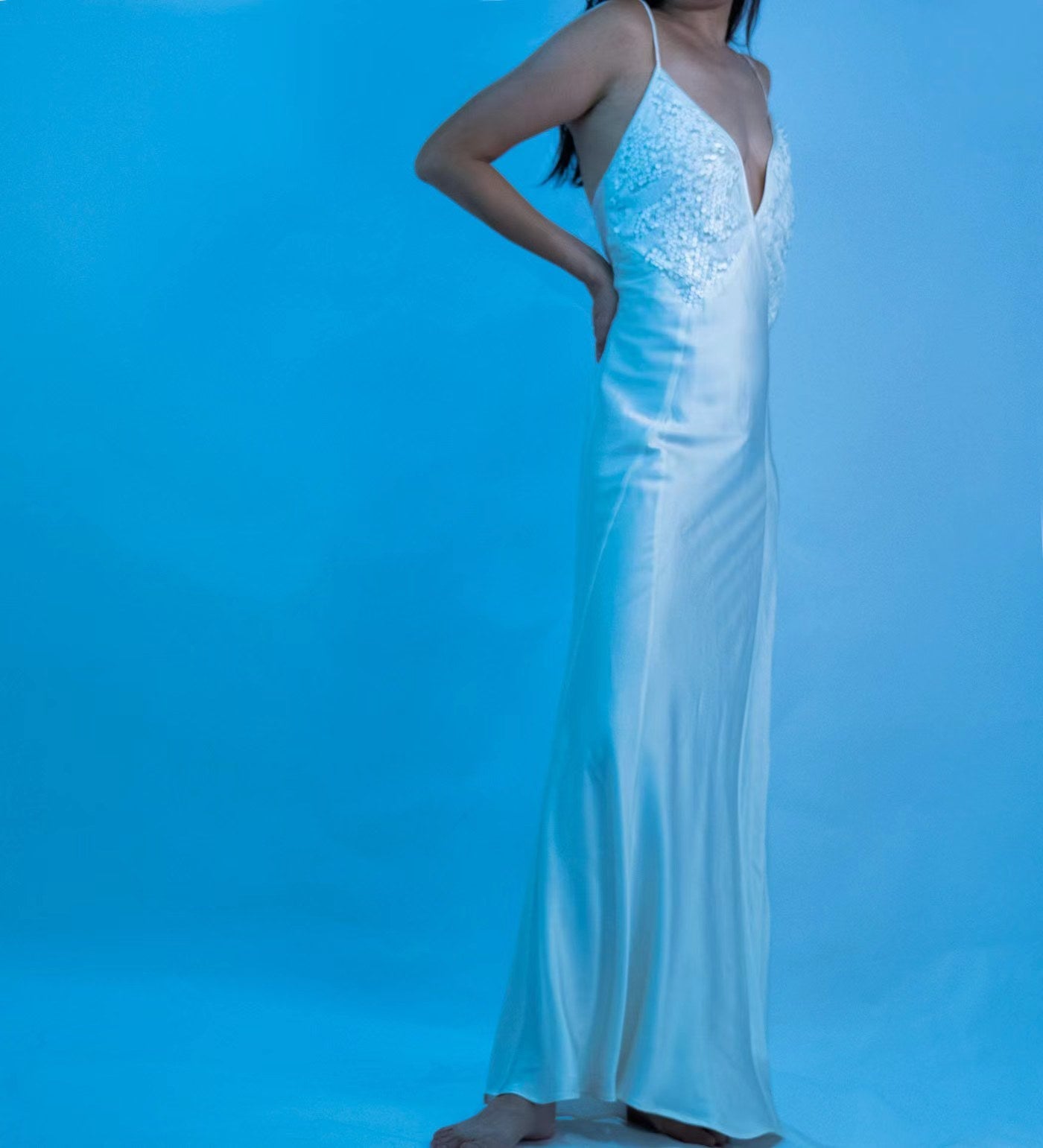 This "Chenauh" dress is cut from mulberry silk chemise and embellished with sequin fabric. it's designed to hug your figure and has a deep V-neckline with slim straps.