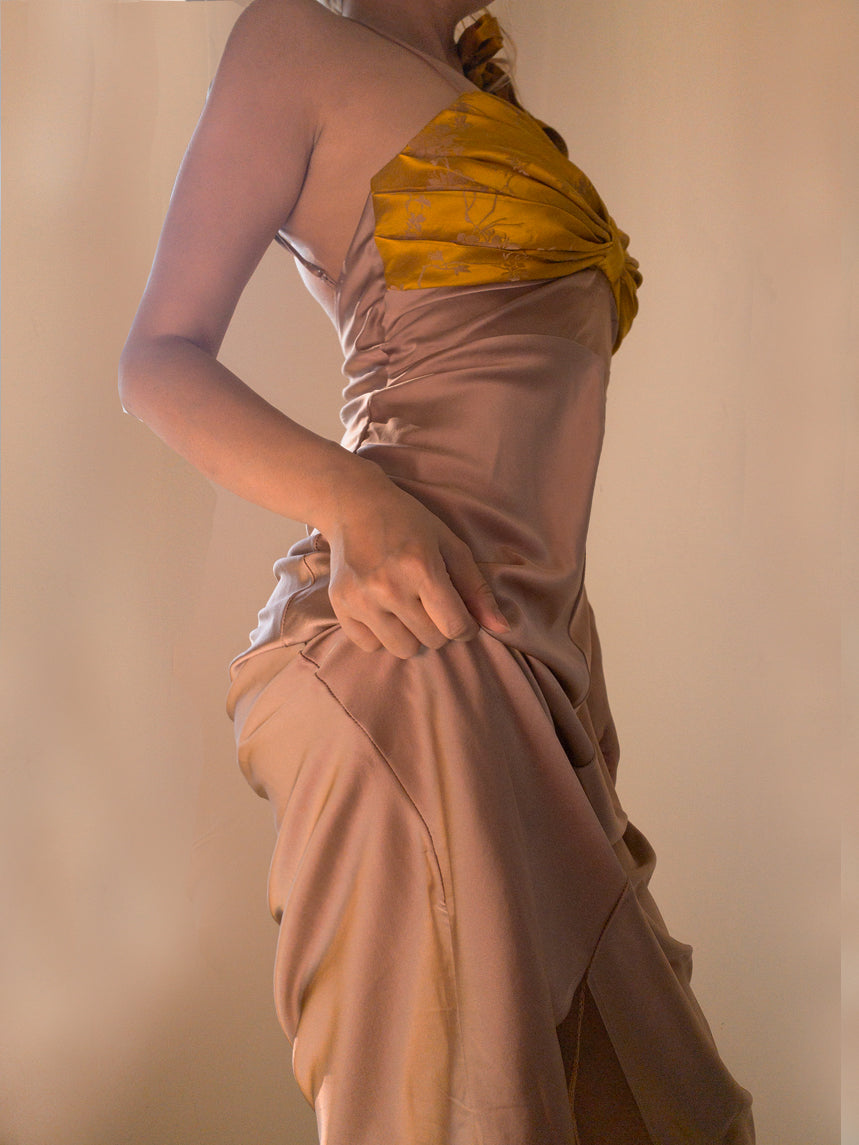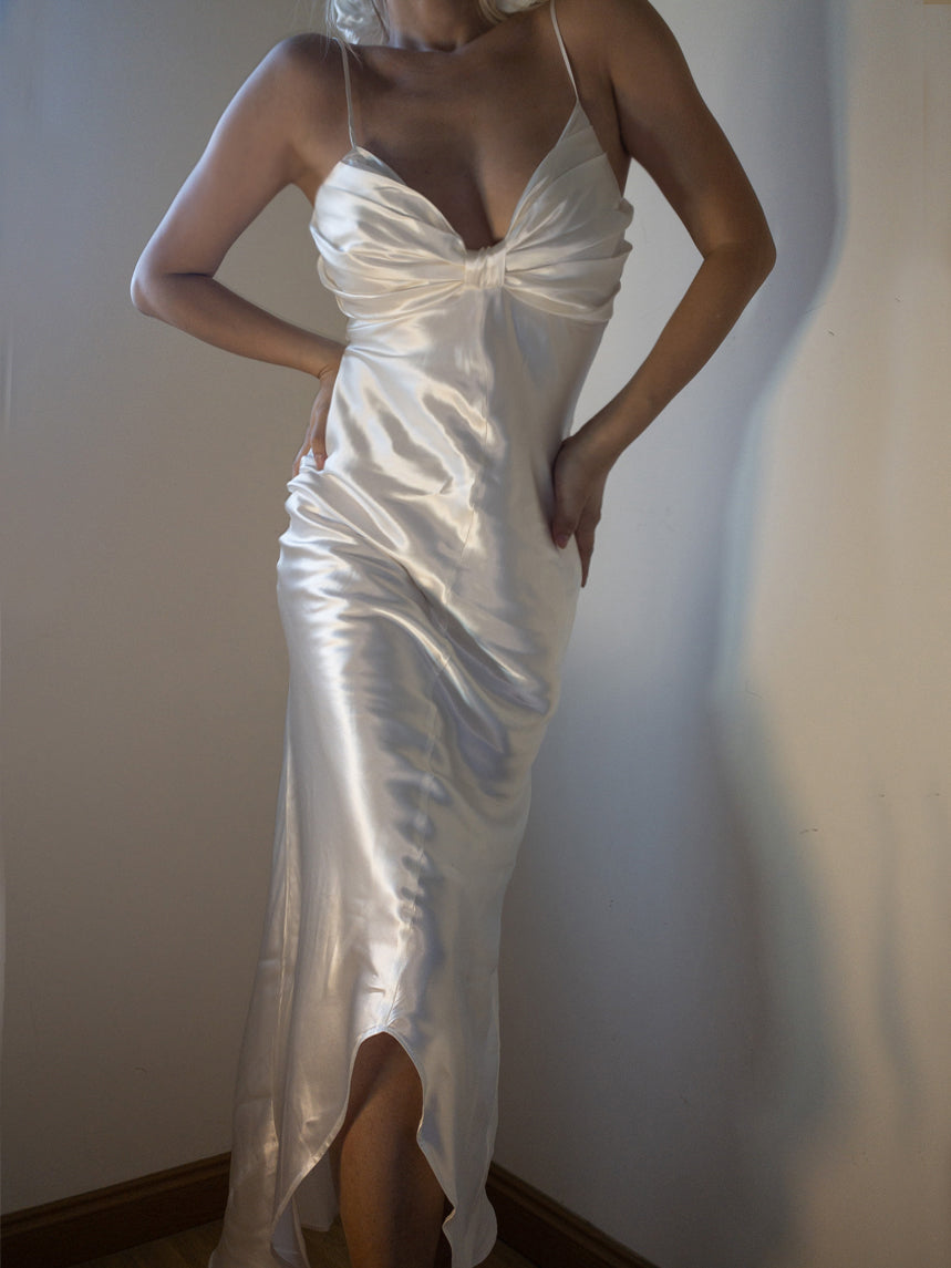 Hold the measuring tape at your hollow while a friend pulls it down to the length you want your dress.