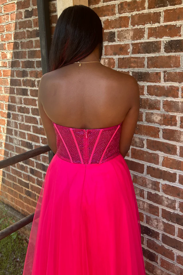 Step into a world of glamour with the Abysmal A-Line Strapless Beads Empire-Waist Sleeveless Prom Dress With Slit. This show-stopping design boasts a sleek A-line silhouette made from airy tulle fabric that moves effortlessly with you. creating an enchanting effect as you dance the night away. Available in Hot Pink and Royal Blue. this floor-length gown features a flattering strapless neckline and delicate beaded embellishments that add a touch of sparkle. The empire waistline accentuates your figure. while the sultry slit at the skirt offers a glimpse of leg for a daring yet sophisticated touch. The lace-up back ensures a perfect fit. providing comfort and style throughout your special evening. This dress is a must-have for anyone searching for exquisite evening dresses and formal dresses.