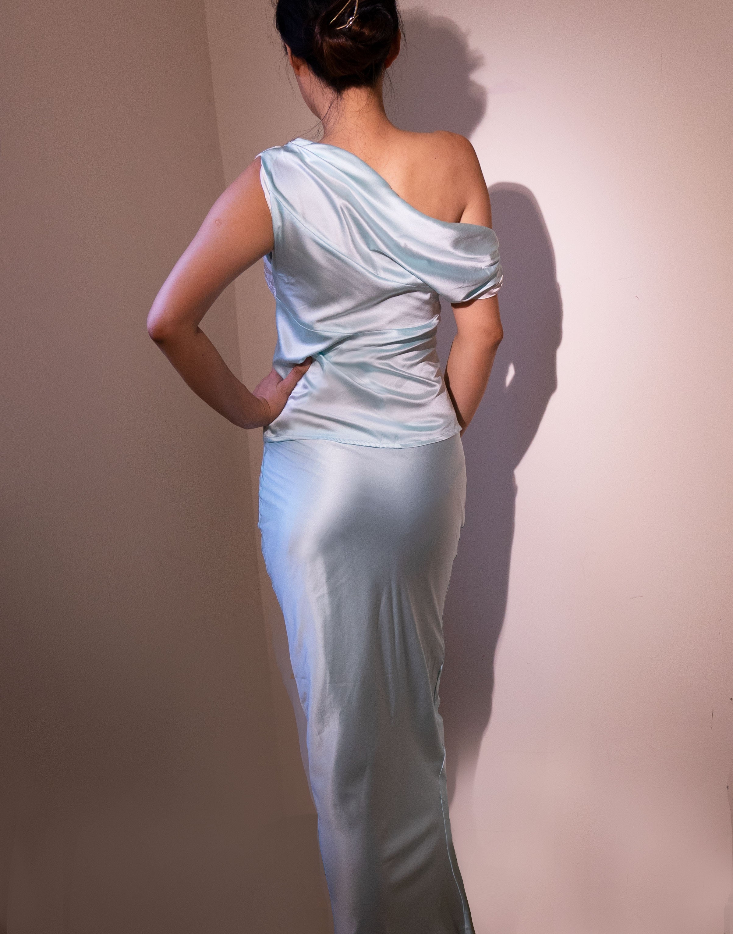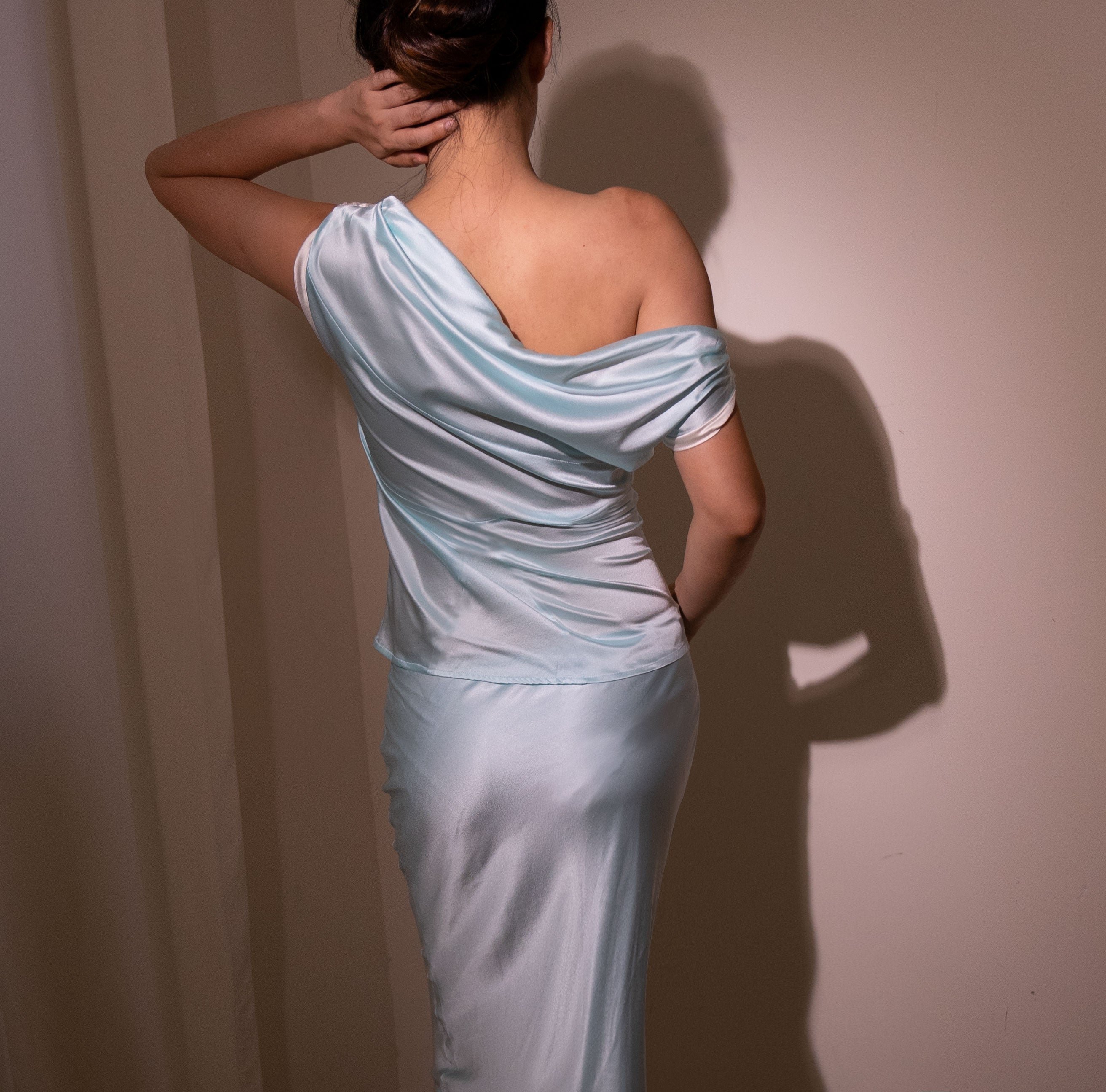 The top of the Arena boasts intricate pleated mulberry lace silk. adding a touch of elegance and sophistication. The skirt is a long flowing masterpiece. made of luxurious blue silk fabric that drapes beautifully and moves effortlessly with every step. The combination of the intricate lace and flowing silk creates a stunning and eye-catching look that is sure to turn heads.