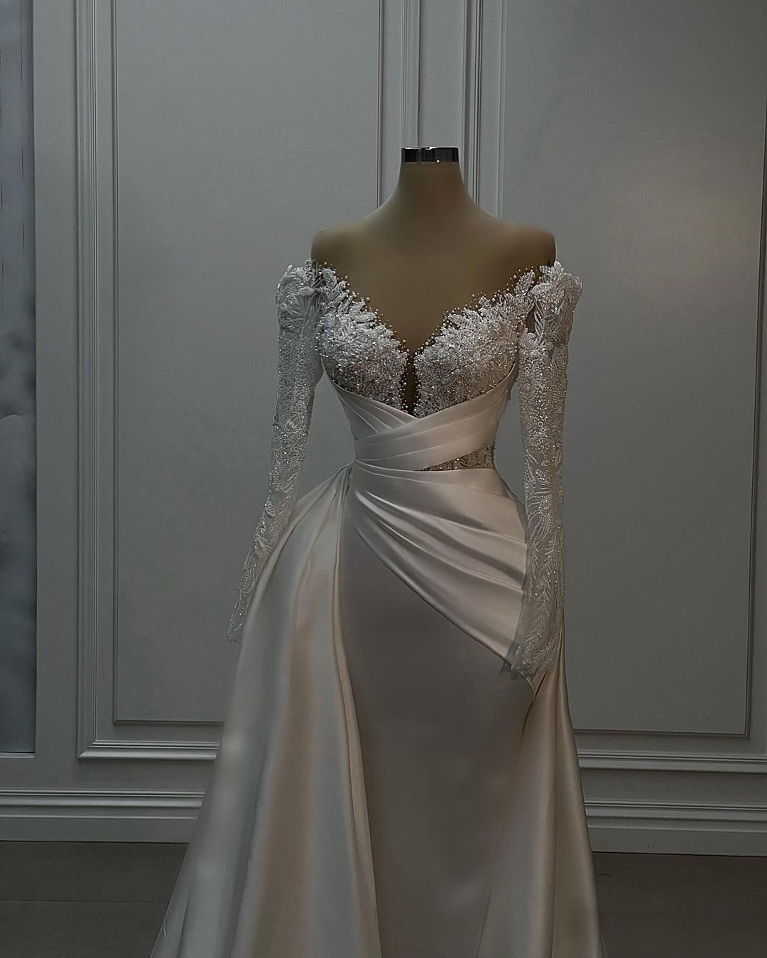 Experience elegance and comfort on your special day with our Beautiful Long White A-line Lace Satin Wedding Dress. The intricate lace and flowing satin combine to create a stunning A-line silhouette. while the long sleeves add a touch of sophistication. Make your dream wedding a reality with this beautiful dress.