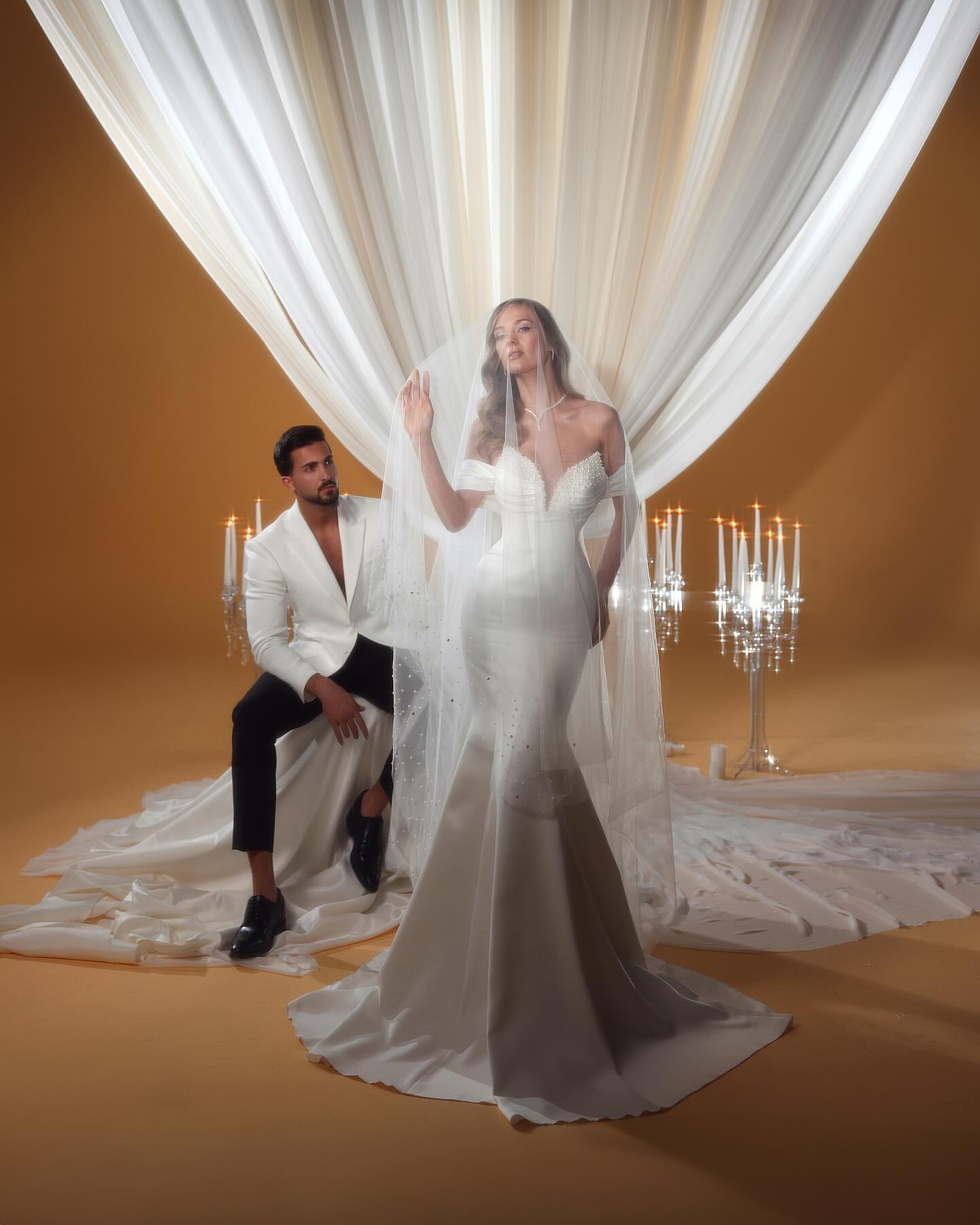 This charming mermaid wedding dress features an elegant off-the-shoulder neckline and sleeveless design. adorned with delicate ruffles. Crafted from high-quality satin. it offers both style and comfort for your special day. Elevate your bridal look with this stunning dress. perfect for any modern bride.