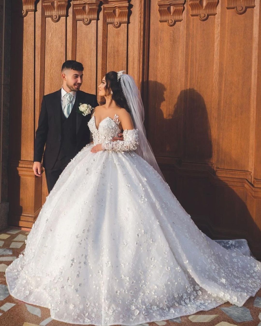 This chic long white v-neck a-line wedding dress is a stunning choice for any bride. The elegant appliques and sleeves add a touch of sophistication. while the train adds a dramatic flair. With its classic silhouette and beautiful details. this dress is the perfect combination of style and grace for your special day.