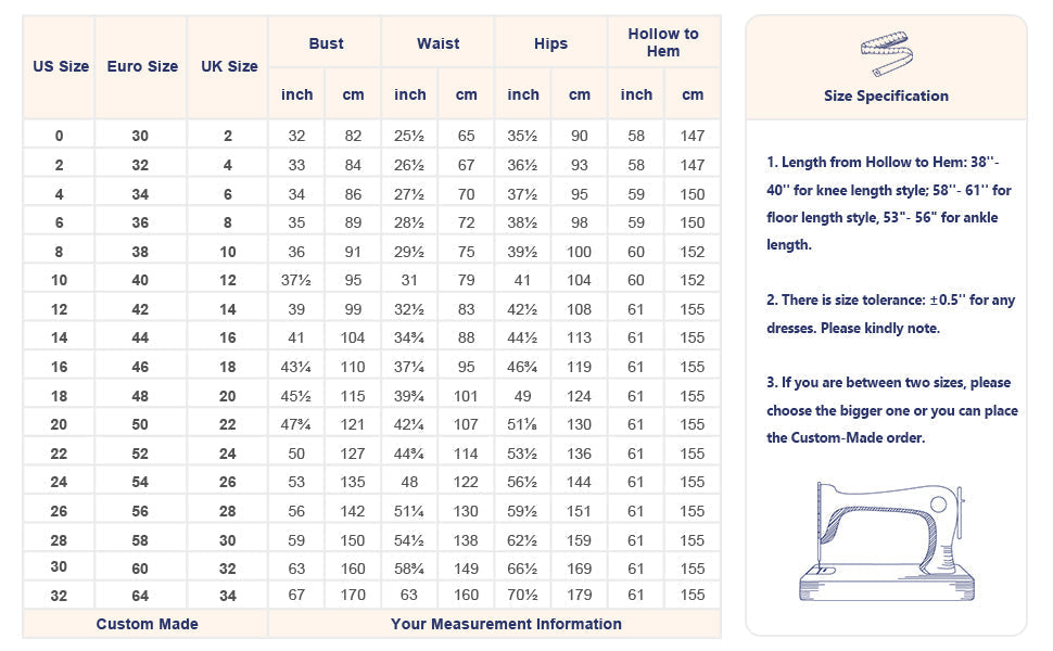 | US SIZE | BUST(inch/cm) | WAIST(inch/cm) | HIP(inch/cm) | HOLLOW TO HEM(inch/cm)) |
