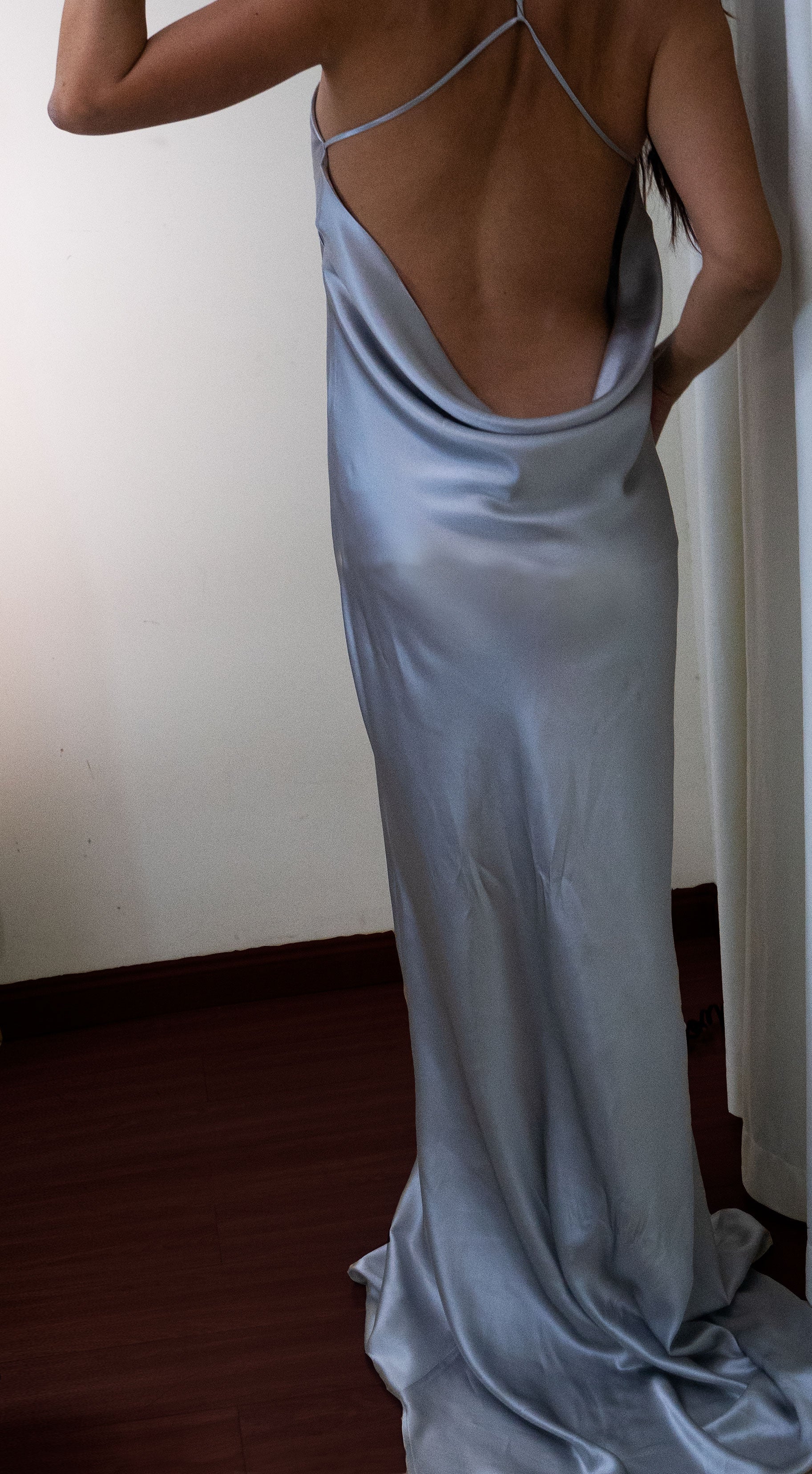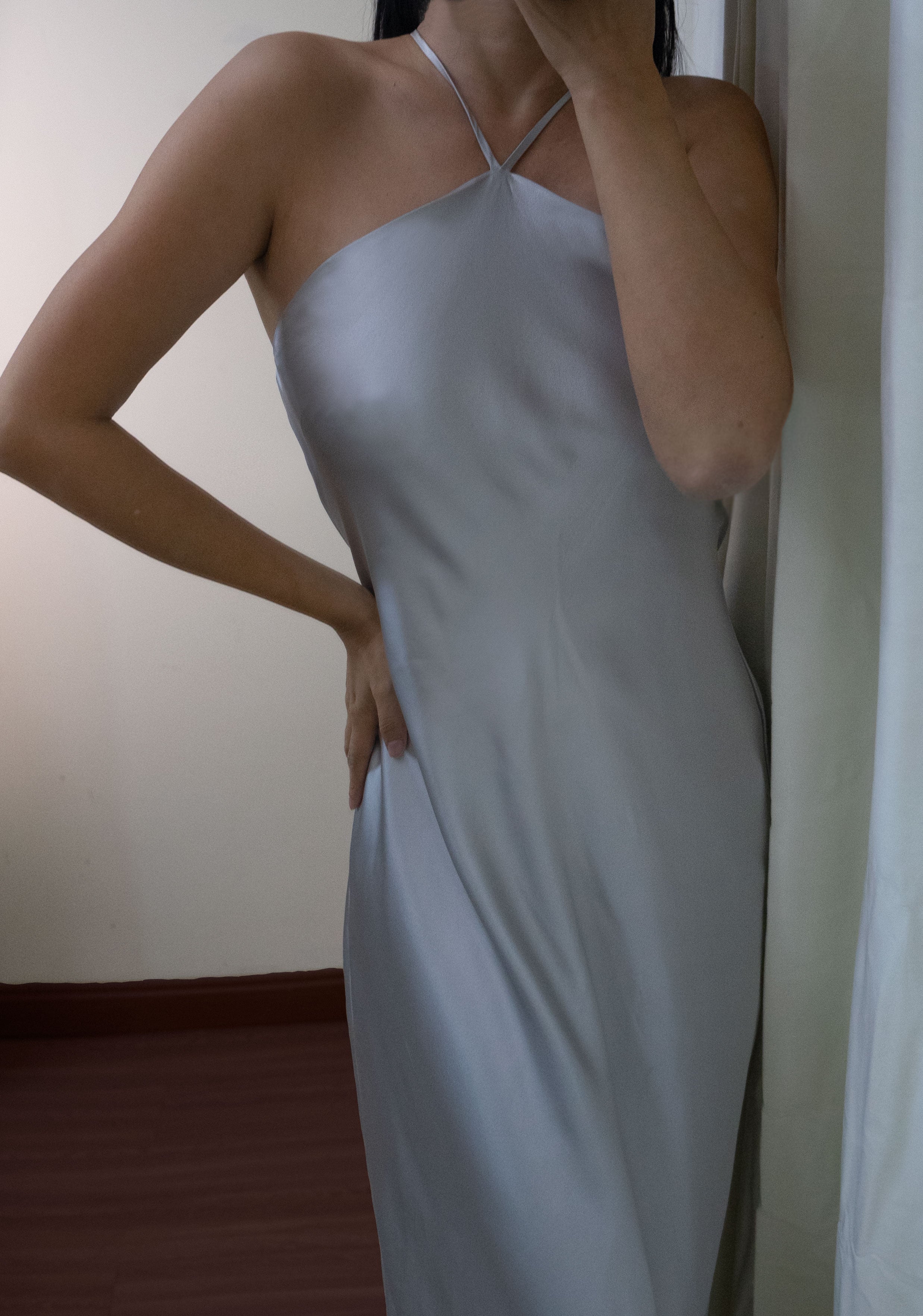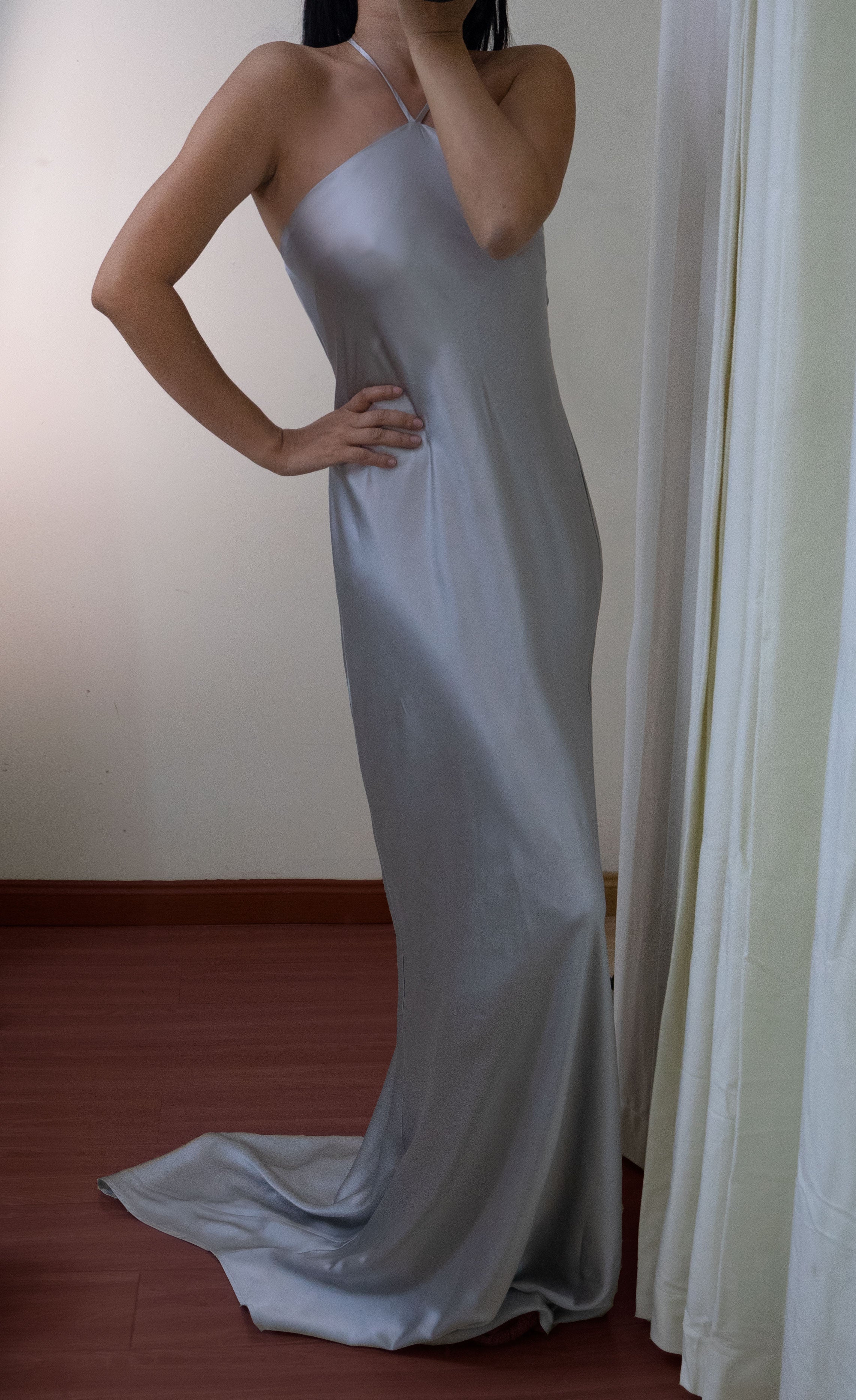/A statement halter neck gown with long ties. This is a contemporary sophistication piece made from softest fabric.