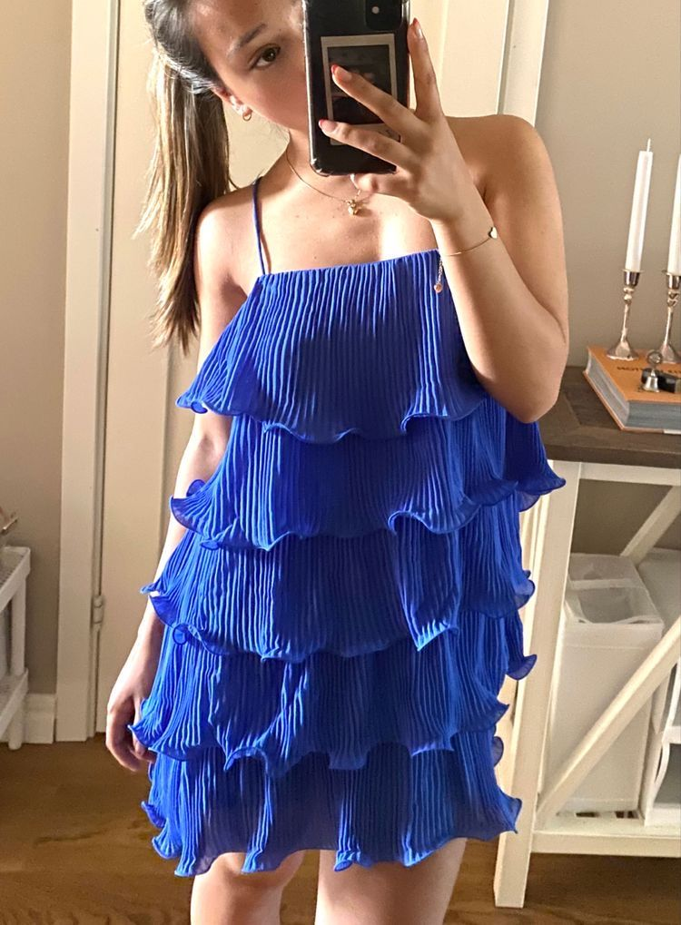 Hold the measuring tape at your hollow while a friend pulls it down to the length you want your dress.