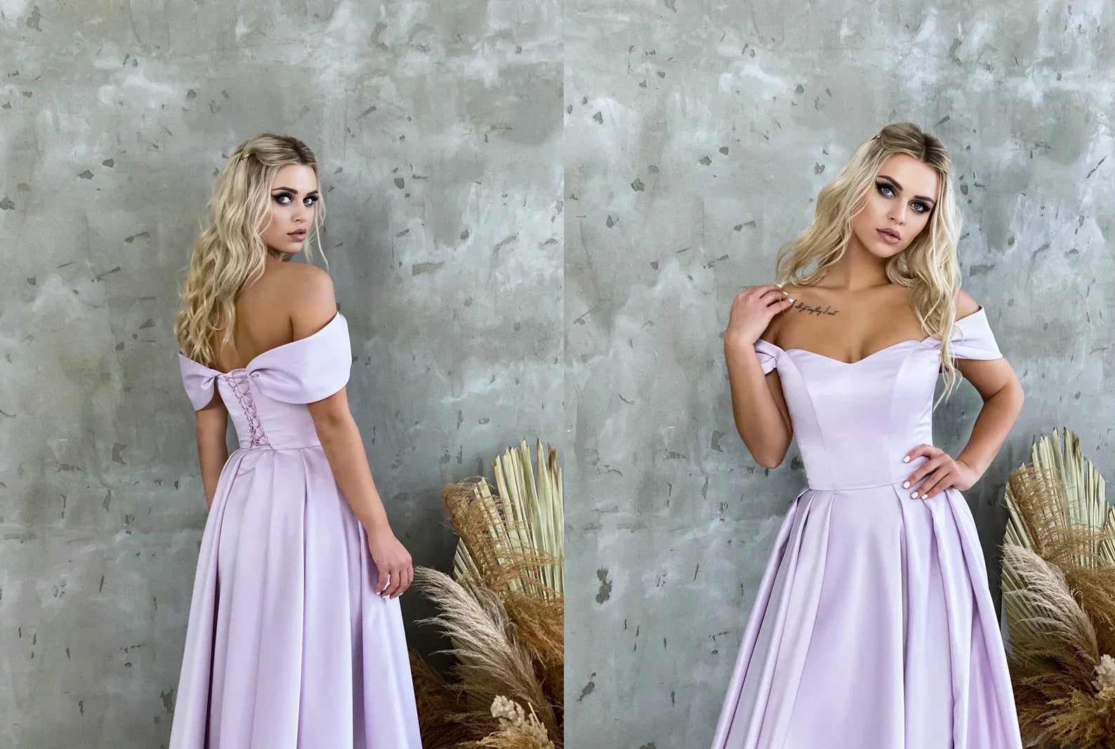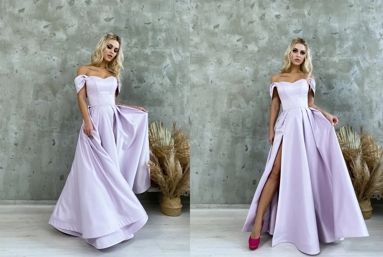 Expertly crafted with luxurious satin. this off shoulder prom dress features a lace-up corset that perfectly adjusts to your size. The long skirt allows for comfortable movement on the dance floor. while the high slit adds a touch of glamour. Make a statement at your prom or formal event.