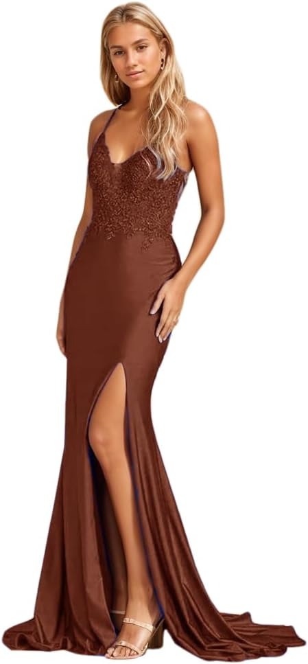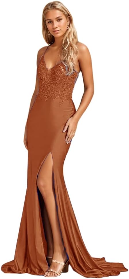 Mermaid Slit Prom Dresses with Spaghetti Strap Sexy V Neck Formal Evening Party Gown