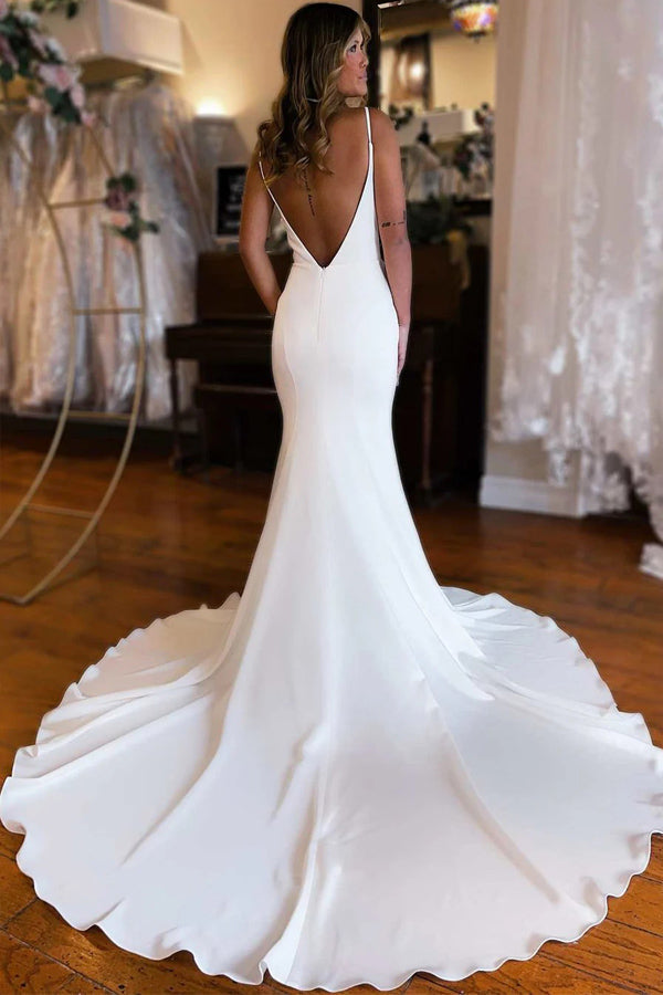 This Plunge V Backless Long Mermaid Wedding Dress WD724 is perfect for the bride looking for a simple and modest gown that won't break the bank. With its mermaid silhouette. it provides a sleek and elegant look. while the backless design adds a touch of allure. A cost-effective option for any budget-conscious bride.