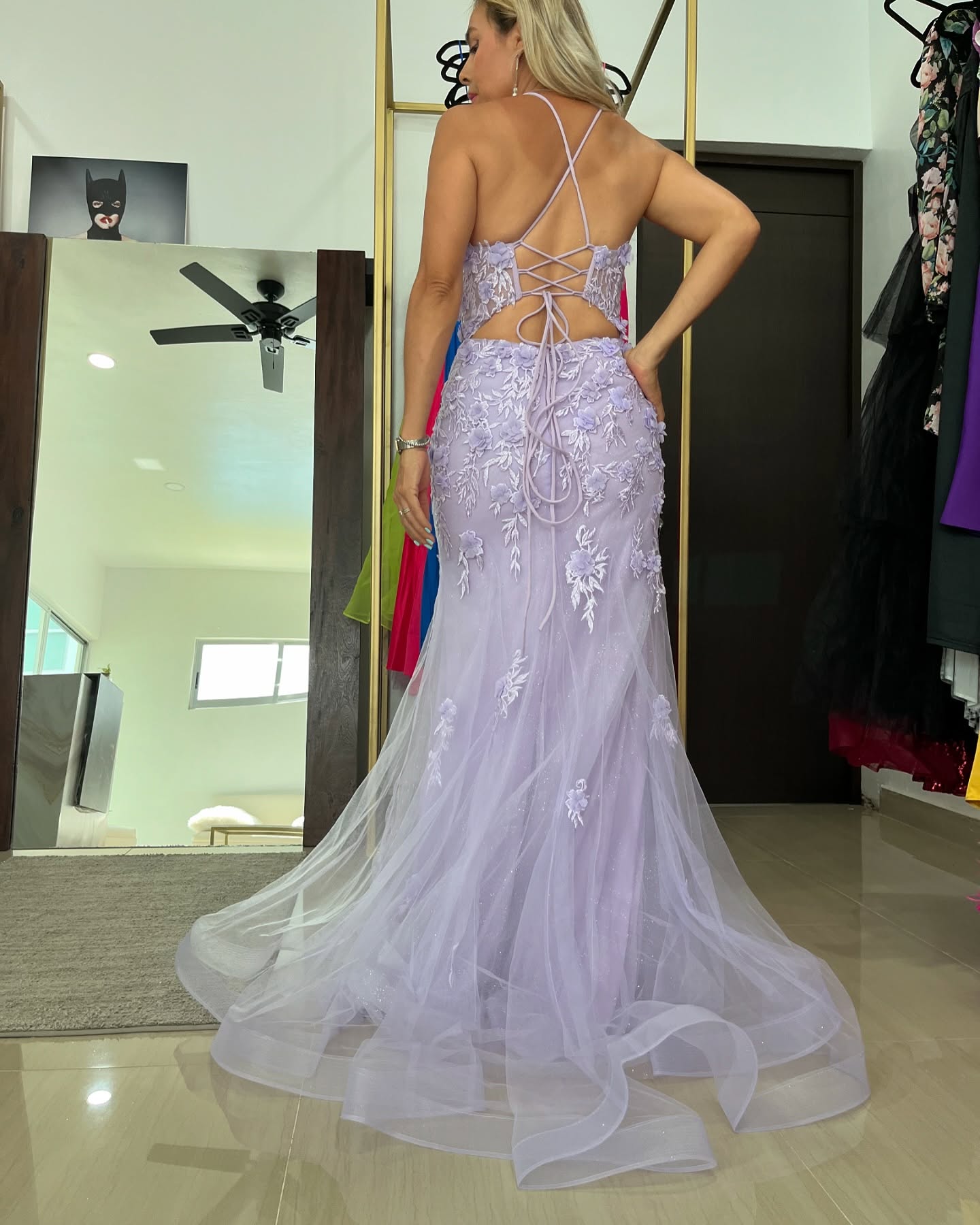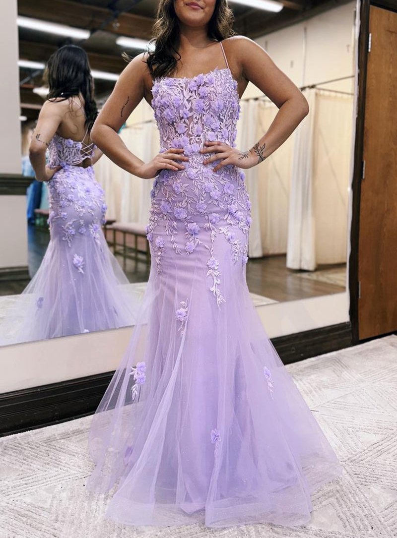 Introducing Armani. a vision of elegance in enchanting lilac. This mermaid-style prom dress. tailored from premium tulle fabric. promises a silhouette that speaks volumes of sophistication. An ideal choice for both evening dresses and formal dresses. with its floor-length gown flows seamlessly into a sweep train. leaving a trail of admirers in its wake. Its spaghetti straps and scoop neckline beautifully frame the décolletage. making room for your most cherished jewels. But what truly sets Armani apart is its intricate detailing – lace appliques and delicate 3D flowers cascade down the gown. from the bodice to the lower skirt. With a criss-cross lace-up back. it ensures a fit as perfect as its design.