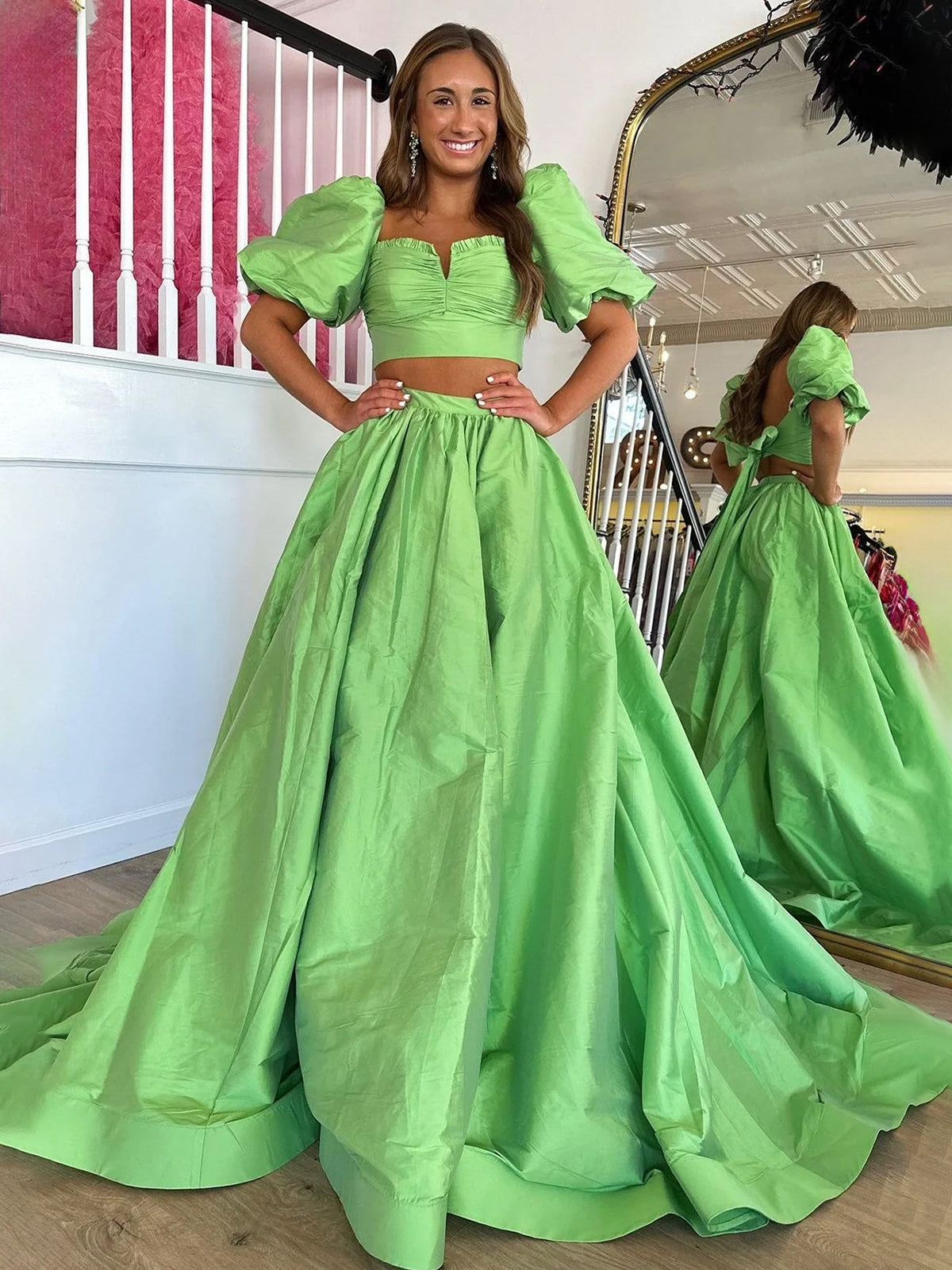 Elevate your prom night look with the Makai Two-Piece Puff Sleeves Satin Long Prom Dress with Split. This dress is crafted from luxurious satin fabric and creates an A-line silhouette that flatters the figure with a soft. flowing movement. It is available in a variety of vibrant colors. including Green. Royal Blue. Red. Pink. Yellow. and Magenta. A fabulous selection for both evening dresses and formal dresses. with its chic square neckline. paired with playful short puff sleeves that add a touch of whimsical romance. The two-piece design allows for a modern and fashionable twist. while the bow-knot embellishment adds a sweet and feminine detail to the look. The side split adds a daring element. giving the dress just the right amount of sultry sophistication. With its timeless appeal and fashion-forward design. the Makai dress promises to be a show-stopper at any event.