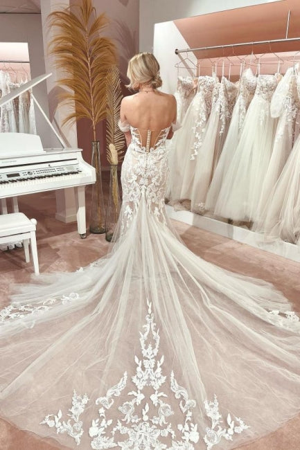 This stunning wedding dress features a mermaid silhouette. sweetheart neckline. and off-the-shoulder design. The floor-length tulle creates a fabulous and elegant look. while the appliques add a touch of delicate detail. Perfect for the modern bride looking for a timeless yet unique look on their special day.