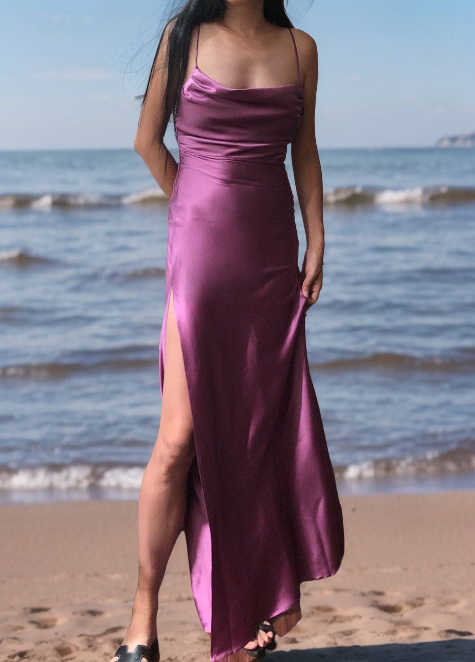 The design features an elegant cowl neckline adorned with delicate ruffled details. echoing the song's romantic mystery. Its bias cut sculpts a figure-flattering silhouette. while the graceful side slit adds a touch of liberation and fluidity with every step.