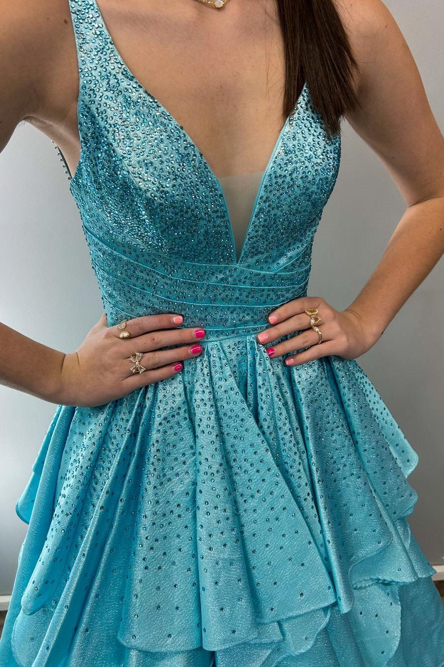 Make a statement at prom with our Aqua Blue Hot Stone Multi-Layer Ruffle Long Prom Dress! The stunning hot stone embellishments sparkle on the taffeta fabric. A fabulous selection for both evening dresses and formal dresses. with its plunge V neckline and lace-up back add a touch of elegance. And with its multi-layer ruffle skirt. this long prom dress will make you the belle of the ball. choose "Nacre". a gown that says you're not here to merely fit in. but to stand out!