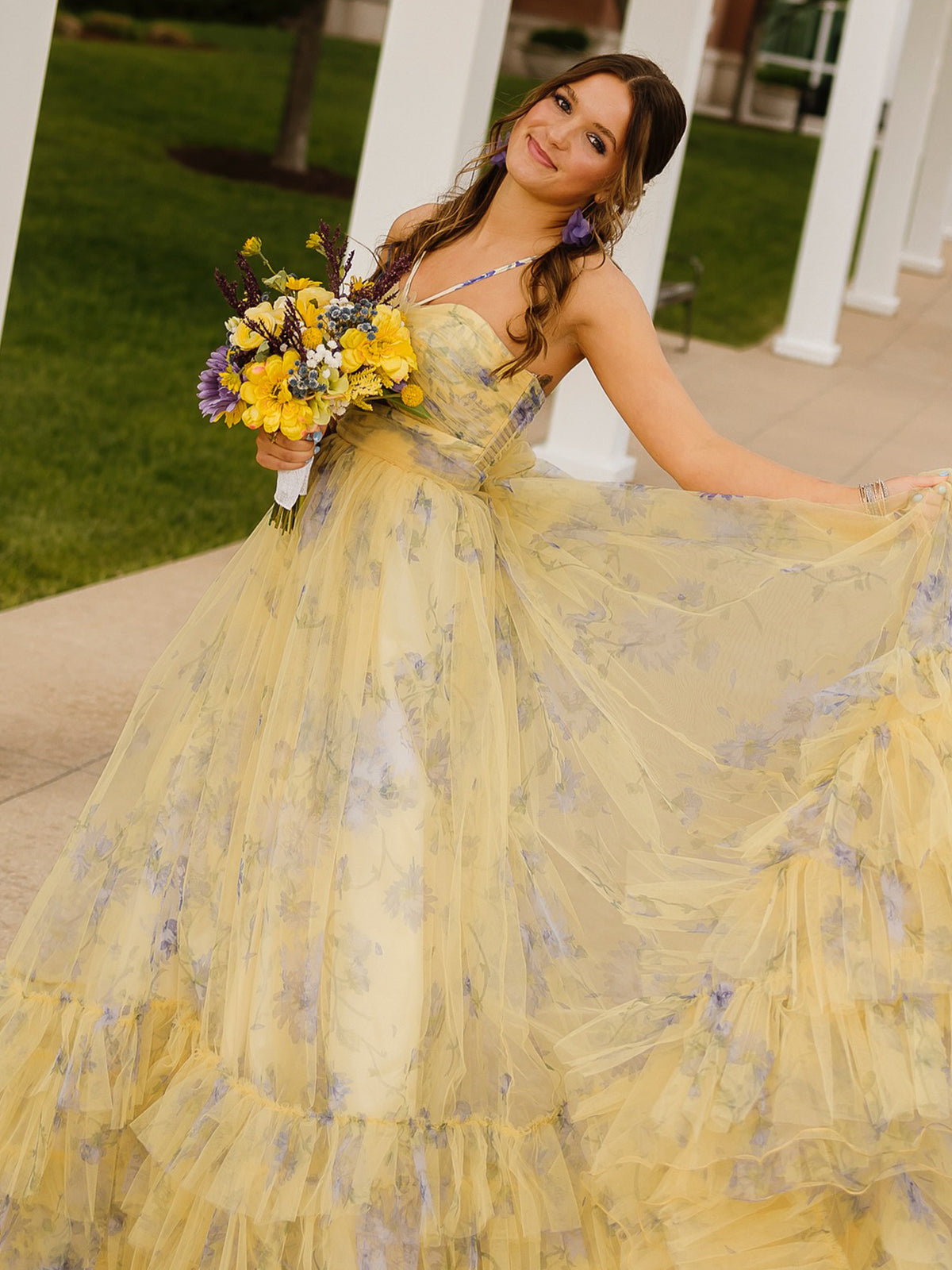 This enchanting A-line gown. available in soft pink. bold yellow. and classic black. is a true showstopper. Crafted from delicate tulle fabric. it offers a dreamy. ethereal feel while maintaining a structured silhouette. An ideal choice for both evening dresses and formal dresses. with its halter neckline adds a touch of elegance. gracefully framing the shoulders. while the sleeveless design keeps it chic and fresh. The playful print embellishment brings a modern. artistic twist. ensuring you stand out at any event. With a flattering sweep train and a convenient zipper back. this dress combines comfort. style. and a touch of whimsy. Perfect for making a stylish statement at any special occasion!