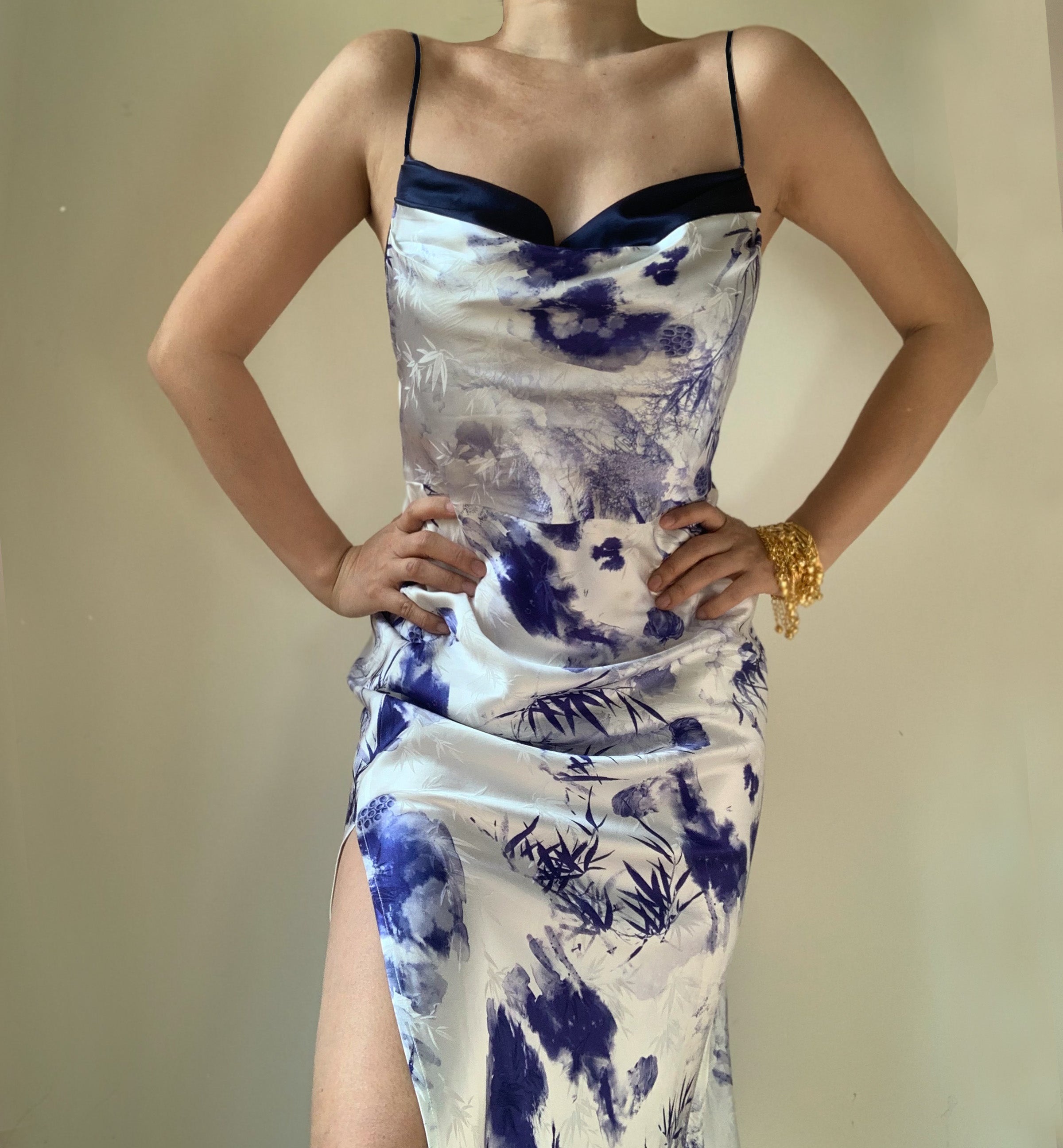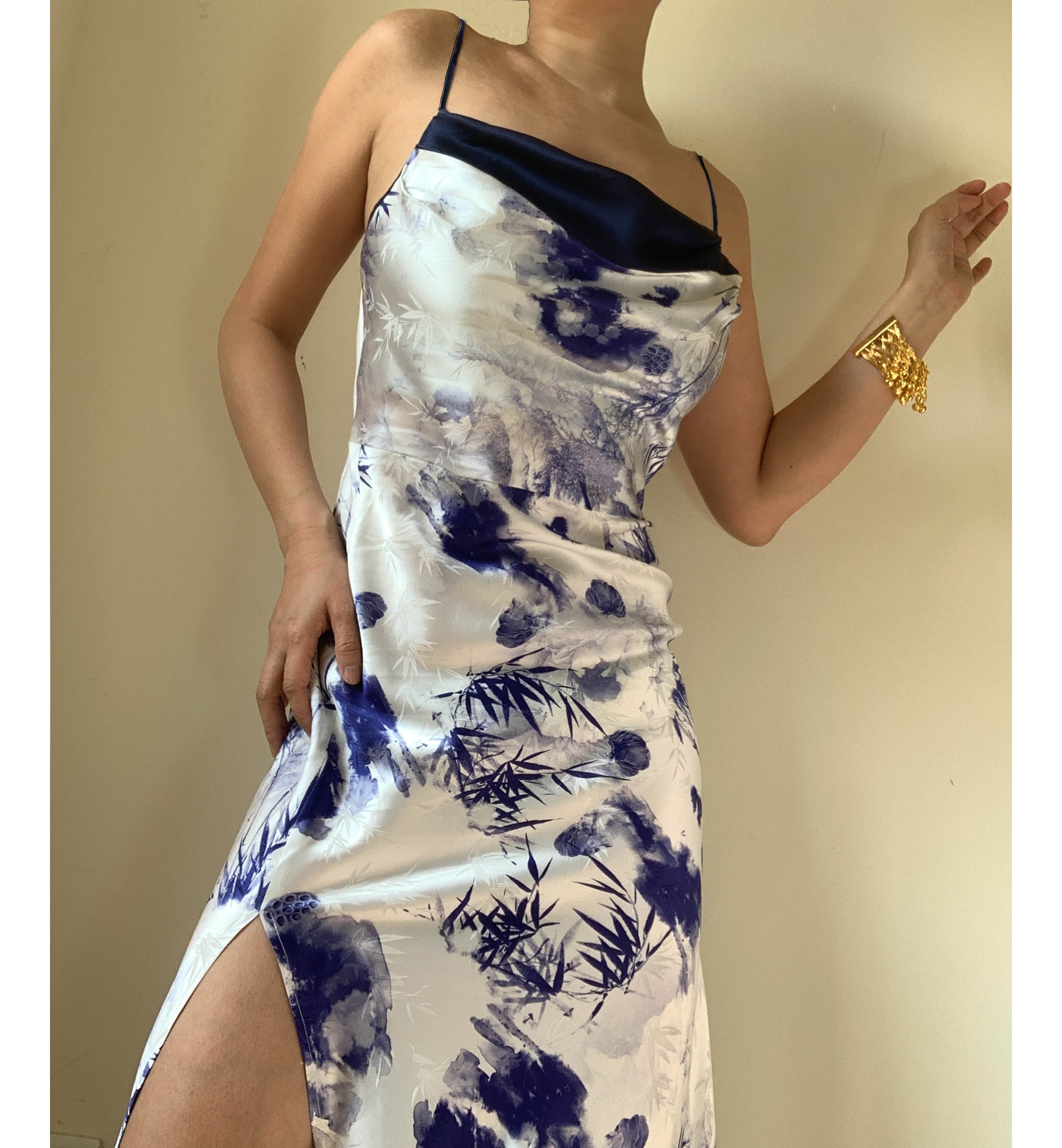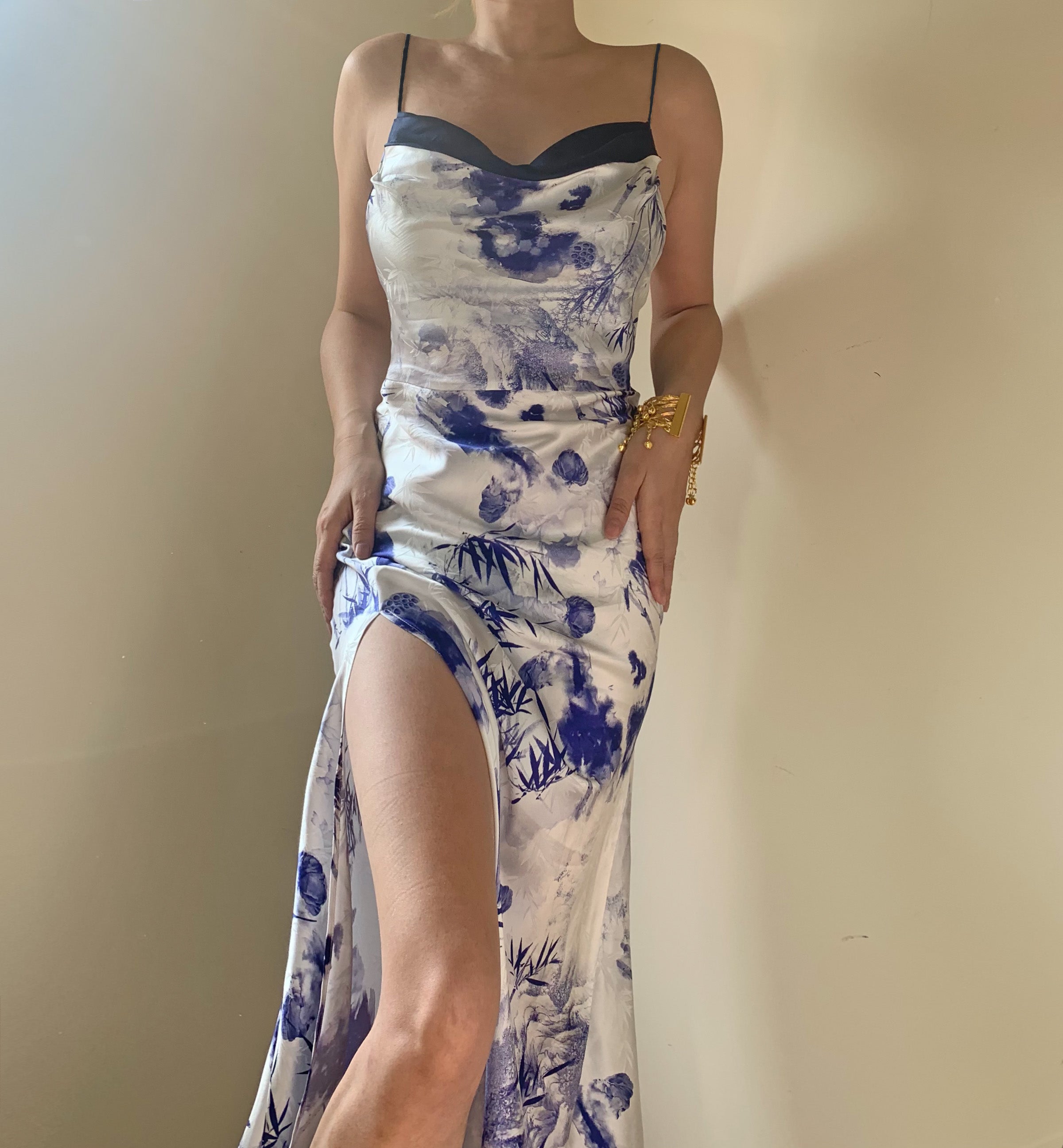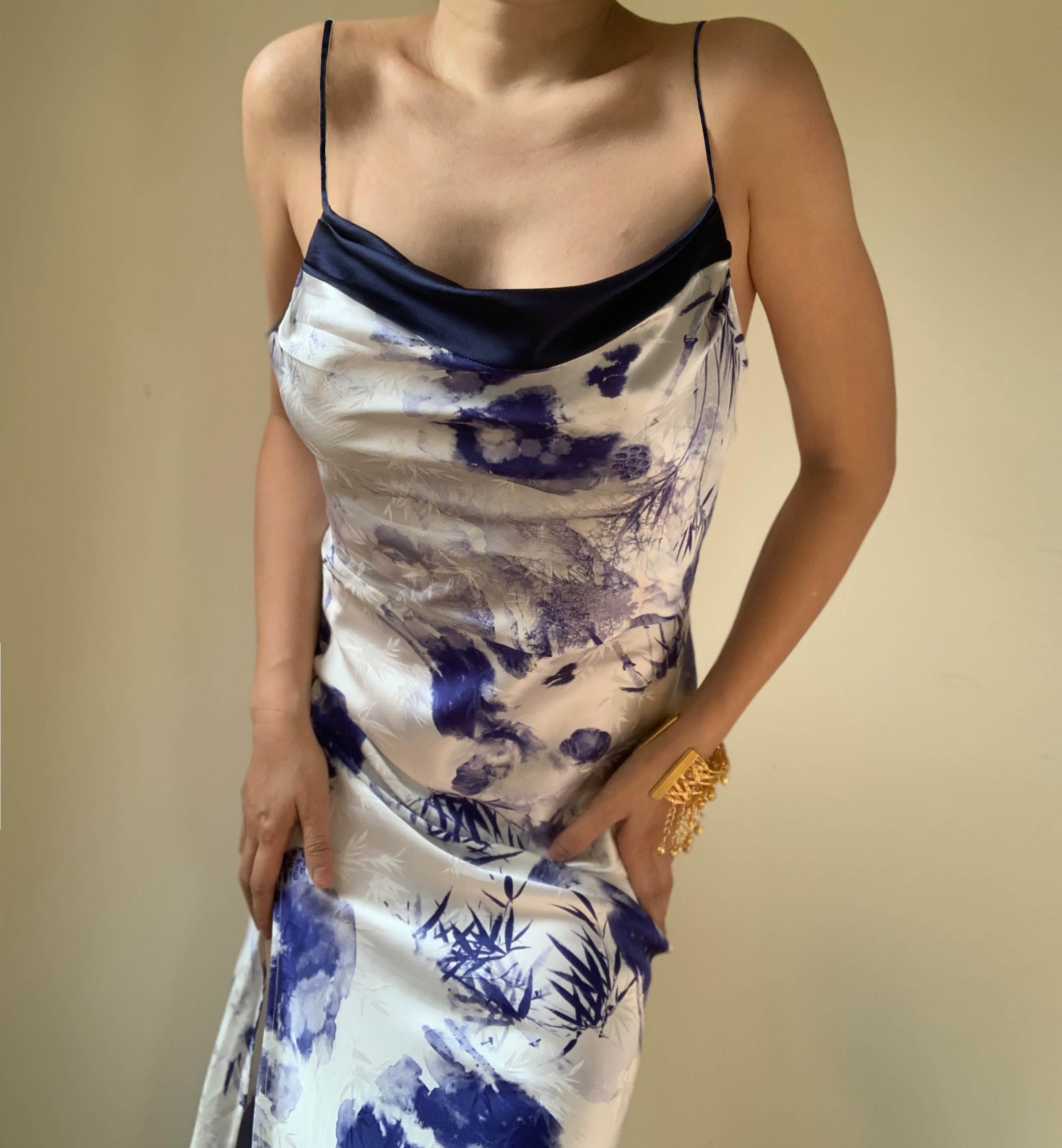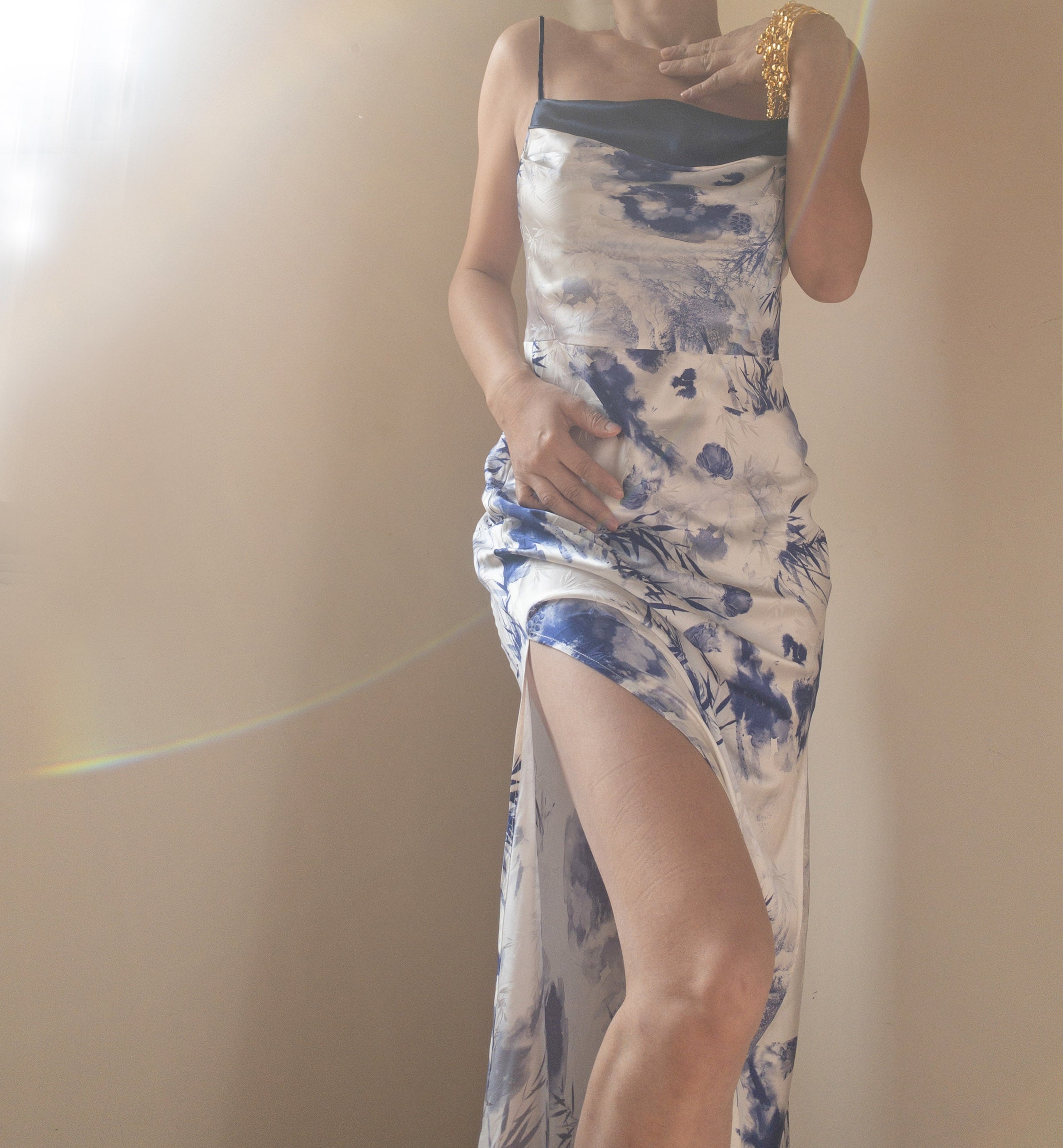 The design features an elegant cowl neckline adorned with delicate ruffled details. echoing the song's romantic mystery. Its bias cut sculpts a figure-flattering silhouette. while the graceful side slit adds a touch of liberation and fluidity with every step.