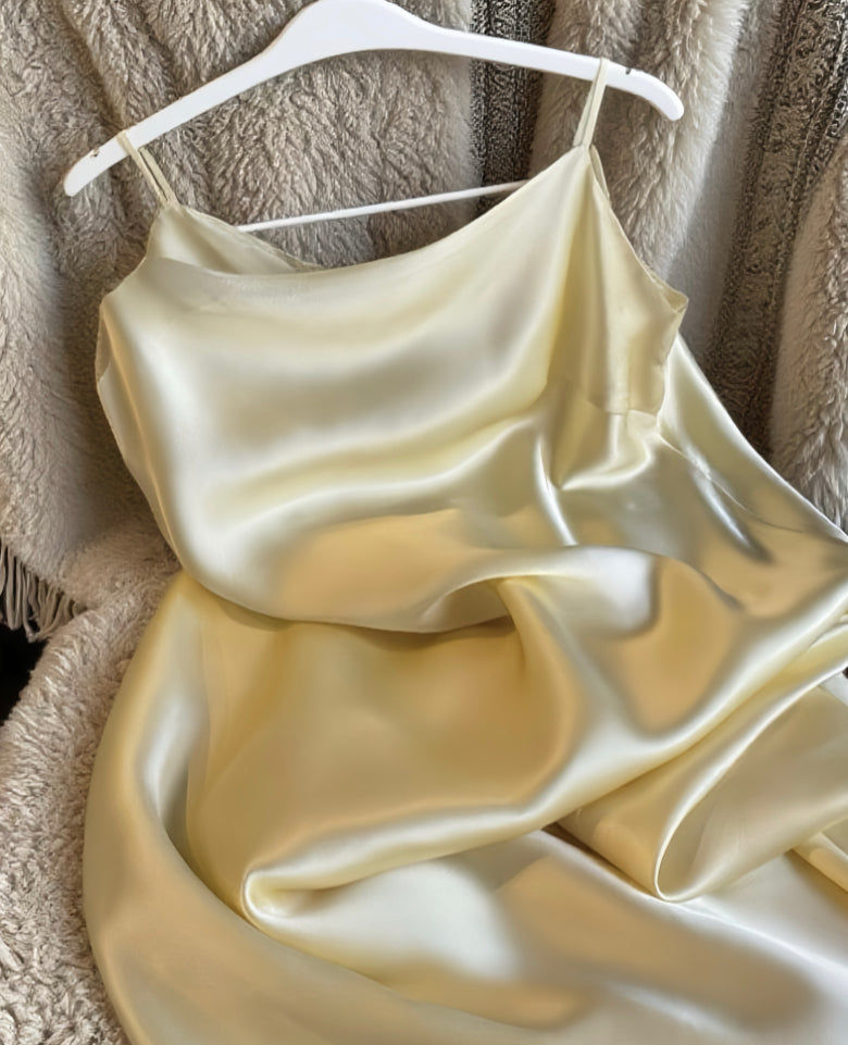 This limited-edition chemise is crafted from the finest premium 19 mommy mulberry silk. offering an unparalleled experience of luxury. It is available in an exquisite. sophisticated shade of Butter Yellow—a warm. soft. and creamy neutral that evokes elegance rather than a bright tone.
