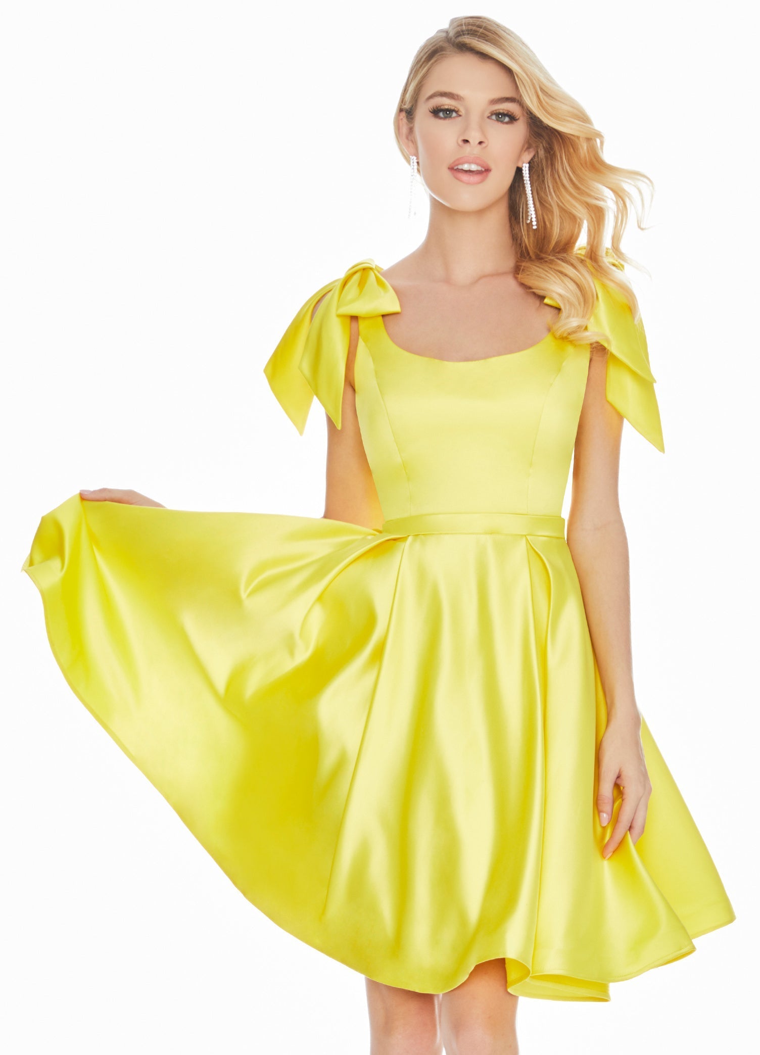 The stunning Satin Yellow Homecoming Dress. a knee-length wonder that exudes sophistication and charm. Crafted from luxurious satin fabric. this A Line Yellow Satin Short Prom Dress features a classic yet modern design that is perfect for making a statement at your homecoming event.