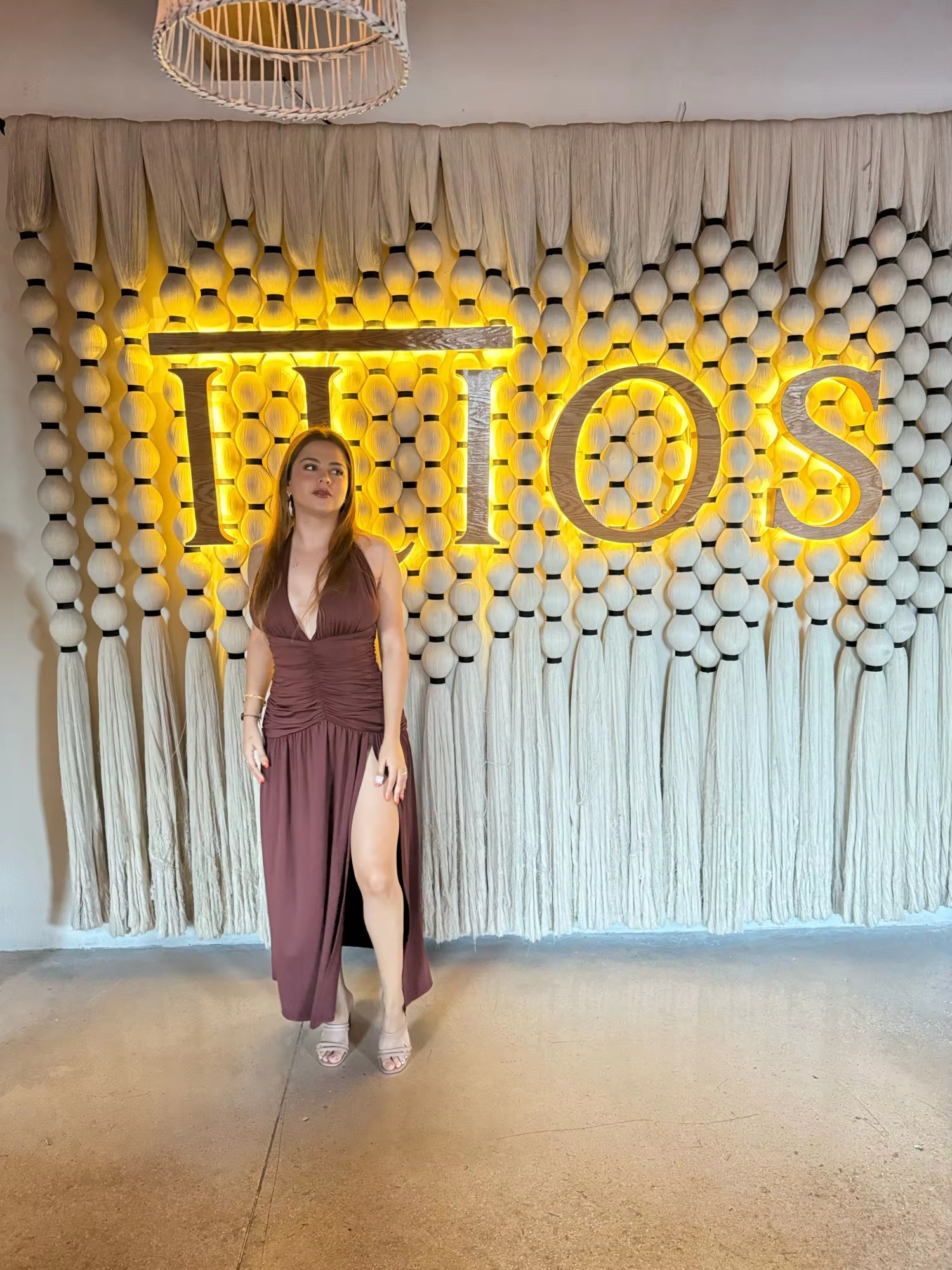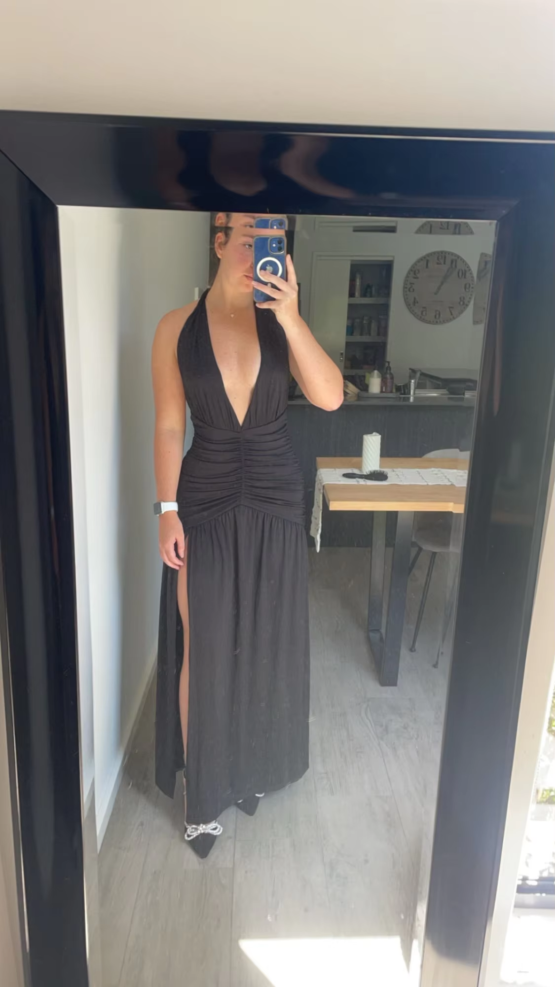 Hold the measuring tape at your hollow while a friend pulls it down to the length you want your dress.