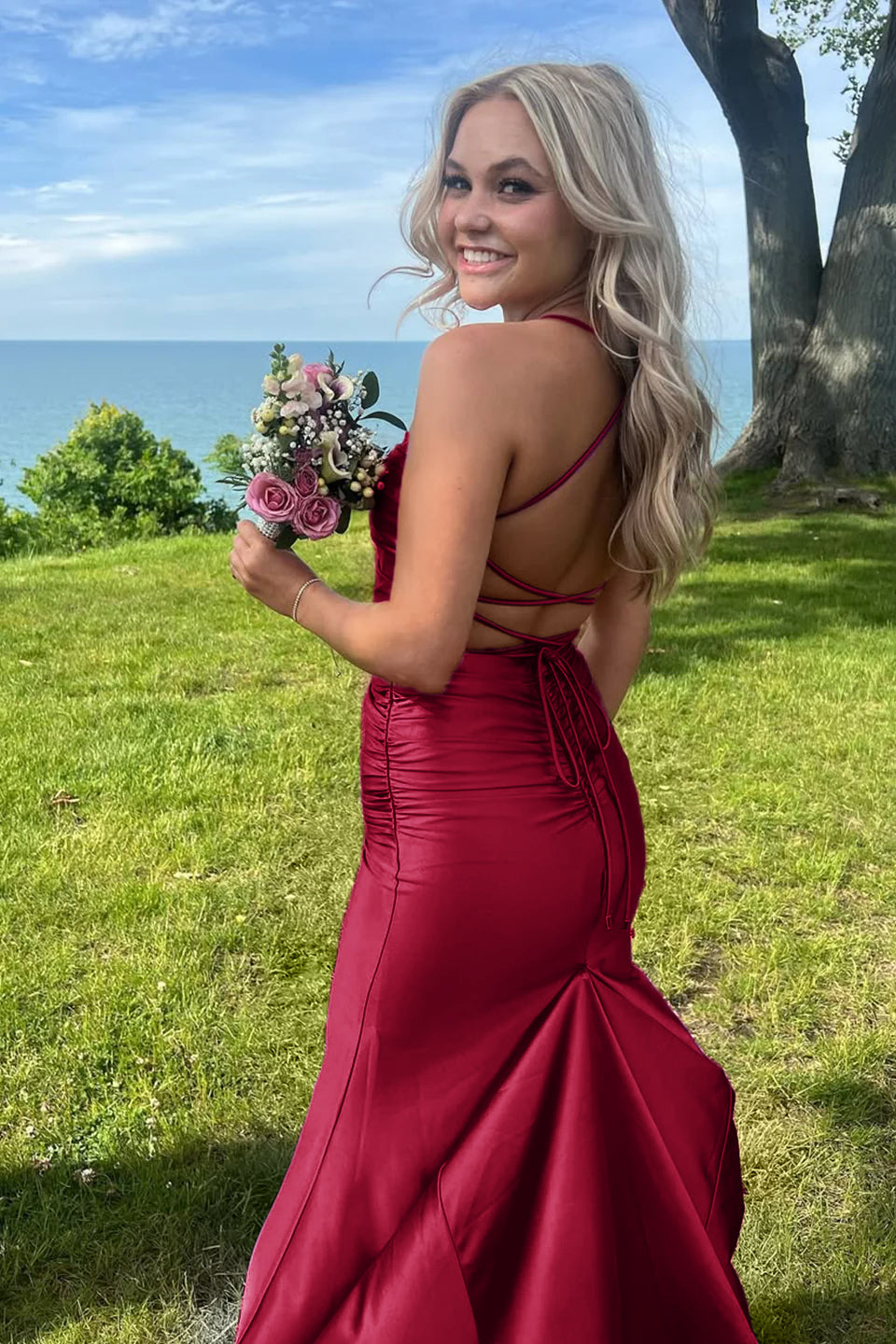 Introducing "Sarai" – where modern flair meets timeless sophistication. Crafted with luxurious jersey fabric. this mermaid-style dress promises a silhouette that's as captivating as the ocean's depths. As an evening dress. its alluring V-neckline. complemented by delicate spaghetti straps. strikes the perfect balance between bold and graceful. The sweep train gracefully trails behind. adding a regal touch to your every step. For a truly unforgettable look. the criss-cross lace-up back ensures you leave a lasting impression from every angle. making Sarai the perfect choice for your next formal event.