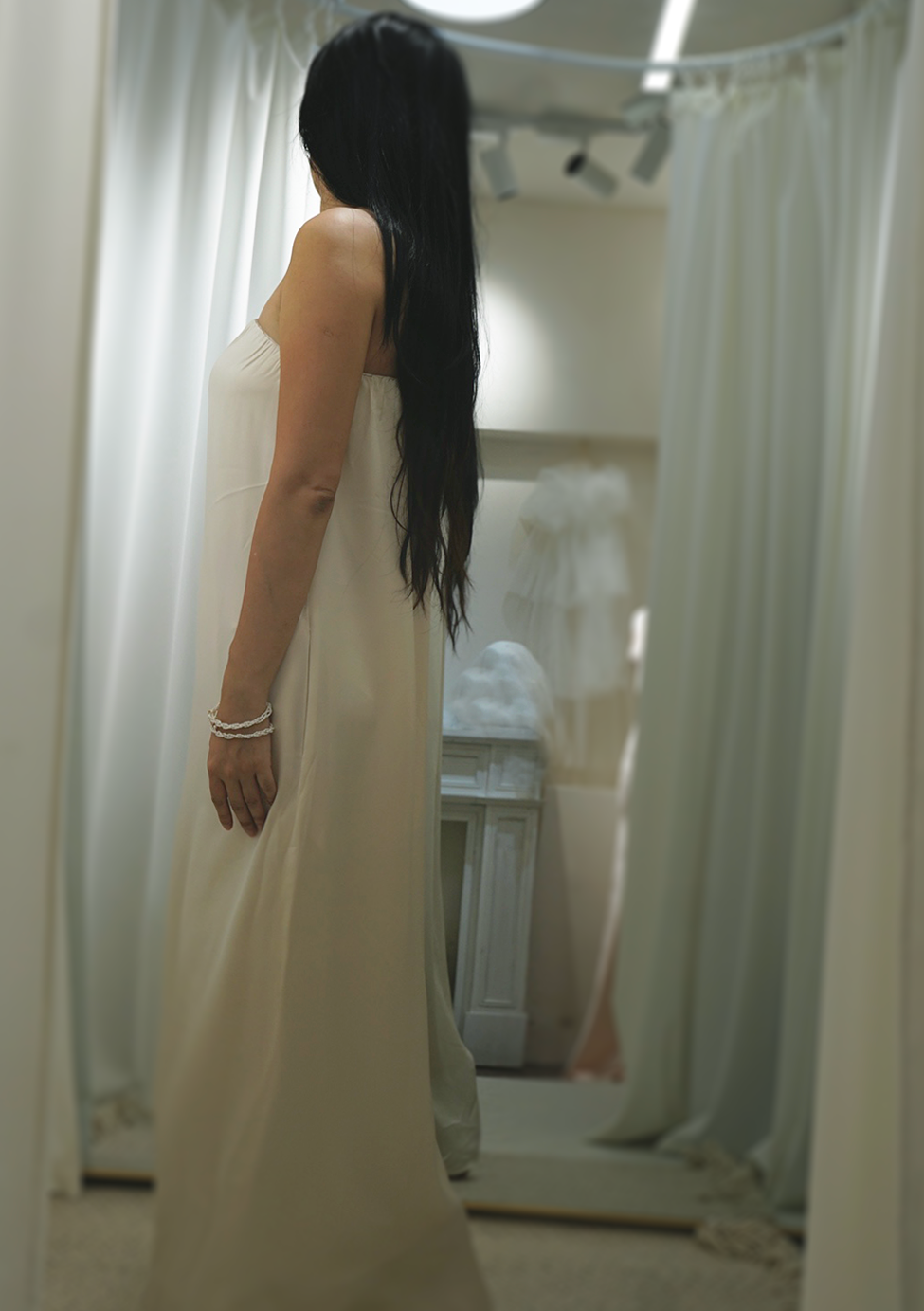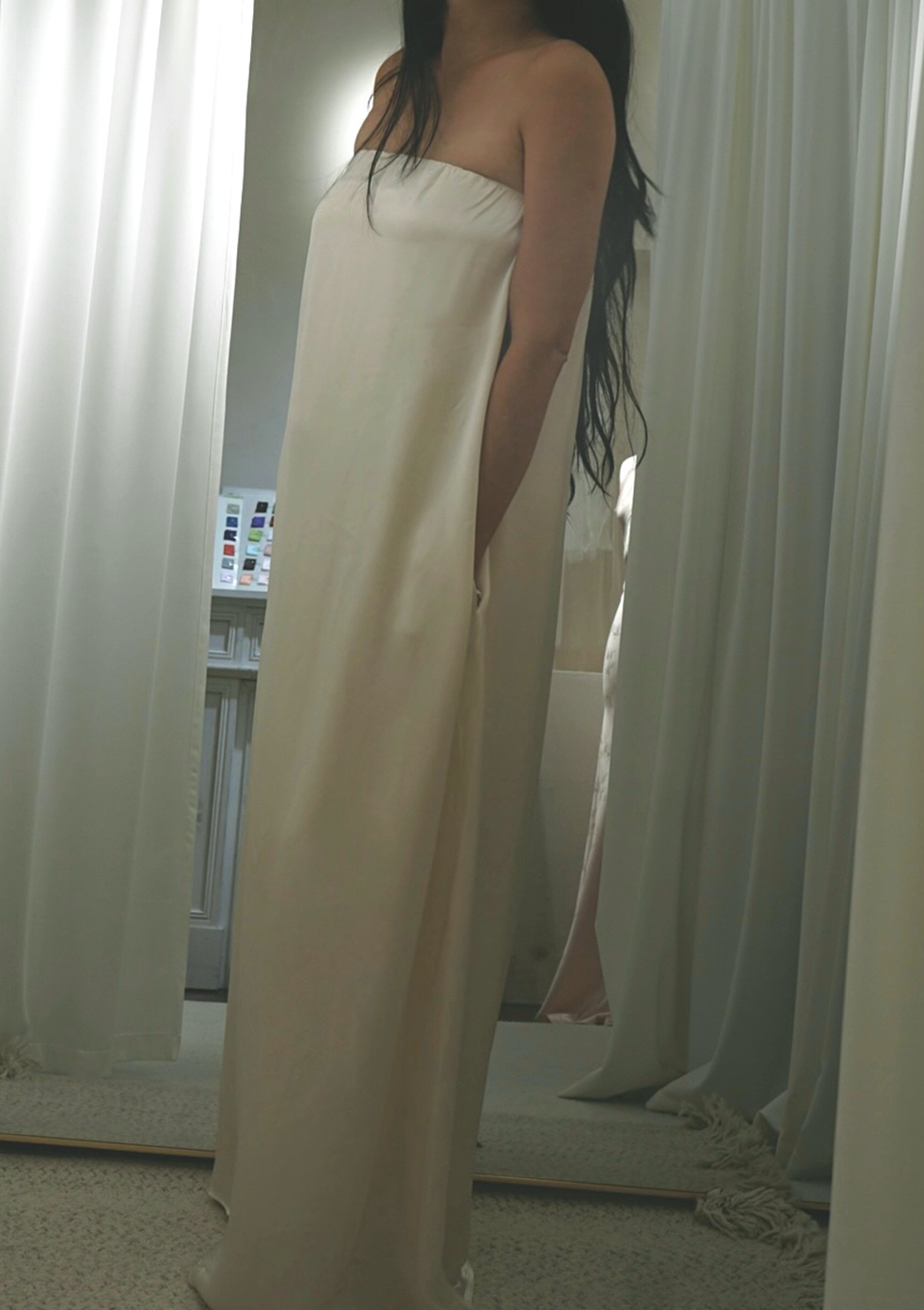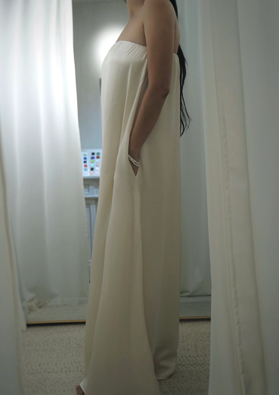 Experience ultimate luxury with our Owena silk wool gown. a masterpiece from our silk studio. This strapless. floor-length dress combines the sheen of silk with the warmth of wool for a comfortable. sophisticated silhouette. Handcrafted to perfection. it's a timeless addition to any wardrobe. ideal for special occasions.