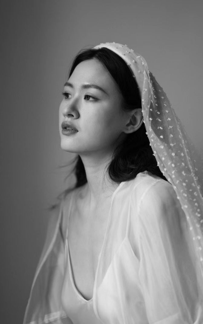 Model wearing Tahani gown in #26 pure white color