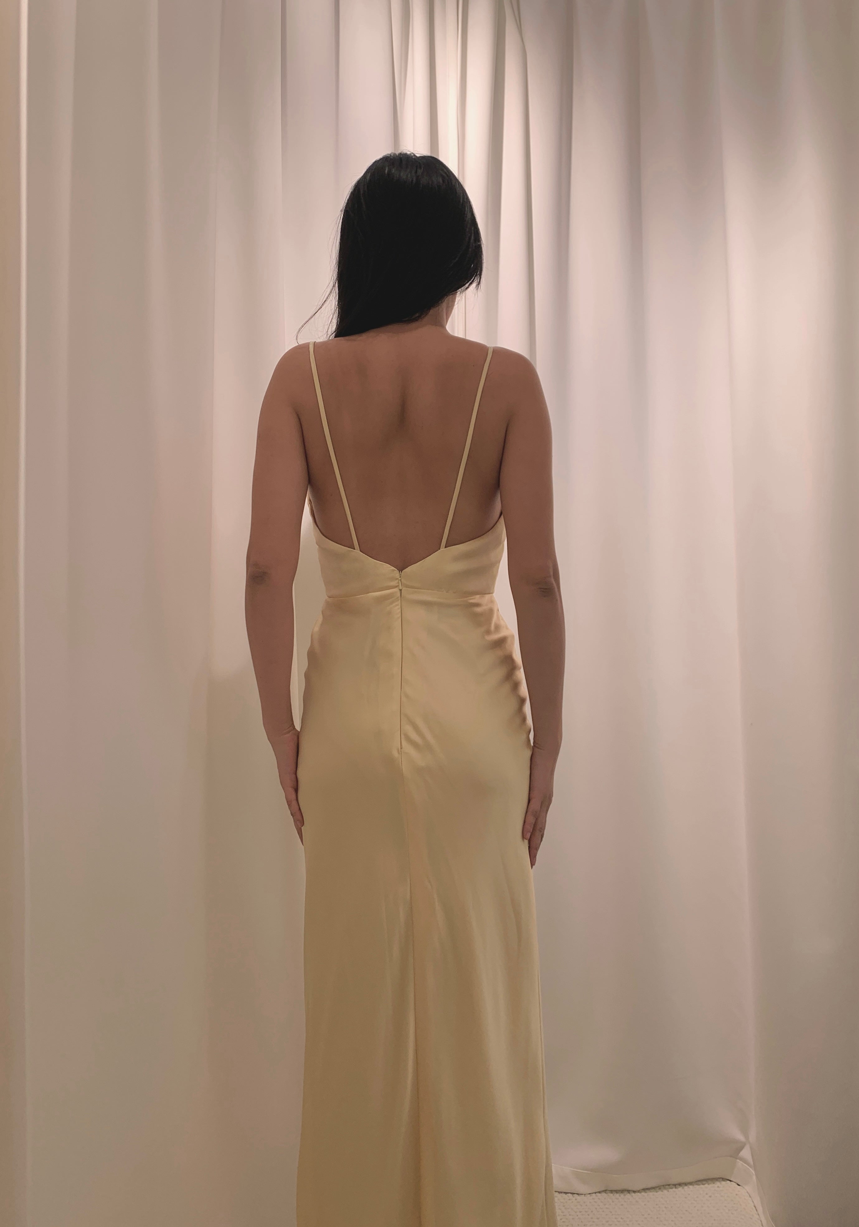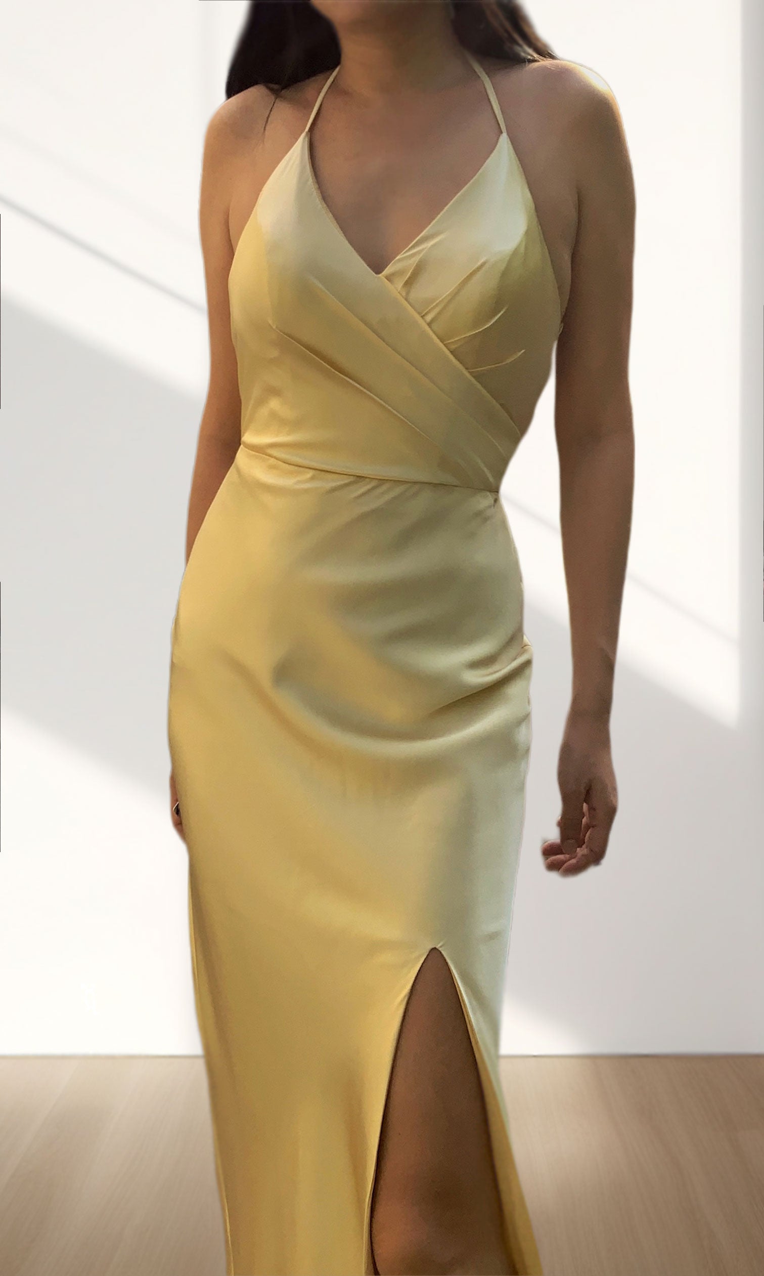 Hold the measuring tape at your hollow while a friend pulls it down to the length you want your dress.