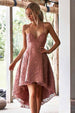 Looking for a modern twist on a classic silhouette? Look no further than this A-Line Spaghetti Straps High Low Blush Lace Homecoming Dress. With features like blush pink. lace. and high low details. this homecoming dress offers a beautiful and sophisticated look in one. Perfect for the stylish fashionista.