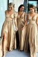 This A-line V-neck Elastic Satin Bridesmaid Dress. BD055. is a stunning and sophisticated style that will ensure the bridal party will look their best. Crafted with a luxurious satin fabric. this dress features a split design and a selection of colors including champagne. gold. and junior bridesmaid. making it the perfect combination of style and comfort for your special day.