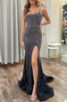 Make a bold statement at your next event with this stunning Black Spaghetti Straps Mermaid Beaded Prom Dress. This dress features a figure-hugging mermaid shape that flares gracefully at the hem. The classic black color complemented by intricate beading along the bodice. adds a touch of elegance and sophistication. The spaghetti straps and sleeveless cut accentuate the shoulders and neckline. while the daring thigh-high slit brings a sense of drama and allure. This dress combines timeless glamour with a modern edge. making you the center of attention.