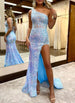 Achieve an enchanting look with Betty's Cute Mermaid One Shoulder Light Blue Lace Long Prom Dresses. This dress is a perfect choice for both evening dresses and formal dresses. with its mermaid silhouette and lace fabric will flatter your figure. while the one shoulder and sleeveless design adds a touch of elegance. The lace-up back and slit detail add a modern twist. making you stand out at any event. Complete the dreamy look with delicate appliques and a sweep train.