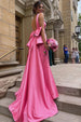 This elegant A-line gown in soft pink satin is the epitome of grace and charm. The V-neckline adds a touch of sophistication. beautifully highlighting the collarbone. while the sleeveless design ensures a sleek. modern silhouette. An ideal choice for both evening dresses and formal dresses. with its backless design enhances the gown's allure. creating a striking. open-back effect that is both daring and elegant. A dramatic slit adds movement to the flowy fabric. while the bow tie detail at the back brings a playful. feminine touch. The sweep train adds a regal finish. making this gown an exquisite choice for formal events. evening affairs. or any occasion where you want to turn heads with effortless elegance.