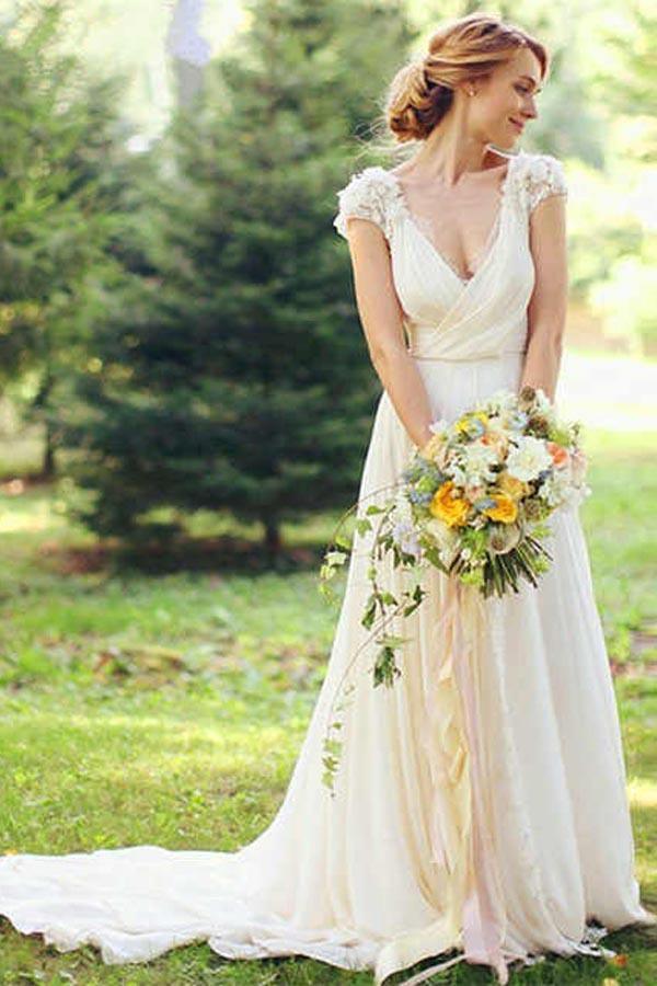 This elegant and slim-fitting Deep V Neck Cap Sleeve Wedding Dress features a sheer back adorned with delicate lace appliques for a timeless look. Perfect for your special day. the illusion neckline and cap sleeves provide a romantic and sophisticated silhouette.