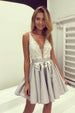 This V-neck grey homecoming dress is perfect for any special occasion. With a flattering silhouette and intricate lace appliques. this short prom dress is sure to make you stand out. From junior homecoming dances to formal events. this dress will make the perfect addition to your wardrobe.
