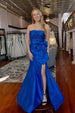 Turn heads and make a statement with the Red Strapless Mermaid Big Bow Satin Pleated Formal Prom Dress with Slit. This dramatic gown is crafted from luxurious satin fabric. offering a sleek. glossy finish that catches the light beautifully. The mermaid silhouette contours to your body. flaring out at the bottom to create a stunning hourglass shape. A bold strapless neckline and sleeveless design highlight your shoulders. while a show-stopping big bow at the back adds an element of surprise and sophistication. The dress also features a daring slit. enhancing your movement and adding a touch of allure. With a lace-up back to ensure the perfect fit. this striking red dress is ideal for those looking to make a statement with evening dresses or formal dresses.