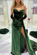 Step into the spotlight wearing this Finnegan dress. the exquisite Emerald Sweetheart Long Prom Dress with Attached Train! Feel the sumptuous velvet as you make your entrance. gorgeous strapless sweetheart neckline enhancing your beauty. An ideal choice for both evening dresses and formal dresses. with its daring slit up the side of the skirt and attached mesmerizing train. Enchantingly finished with gloves for an added touch of drama. Get ready for your night of dreams!