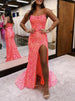 Introducing the exquisite Mermaid Style Dress. a stunning piece crafted from luxurious Lace Fabric in vibrant Fuchsia and Orange. This sweep-length gown features a flattering strapless neckline and a sleeveless design that highlights your silhouette beautifully.