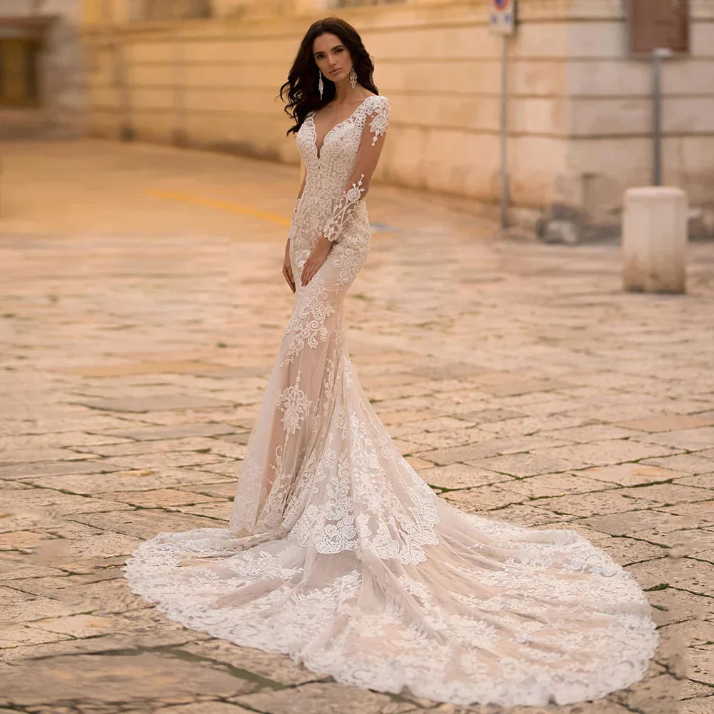 Gorgeous Lace Long Sleeve Mermaid Wedding Dresses Tulle Bridal Gown For Women Cathedral Train V-Neck Appliques Button Back