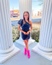 Hold the measuring tape at your hollow while a friend pulls it down to the length you want your dress.