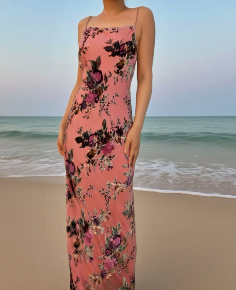 Featuring a delicate floral print in purple and green against a soft pink base. the slim straps and relaxed fit enhance the serene. feminine silhouette. Designed for coastal strolls or golden-hour gatherings. it moves with grace and comfort.