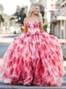 The Santiago prom dress is the epitome of romantic elegance. designed to make you feel like you're floating on air. Crafted from soft. flowing chiffon. this floor-length A-line dress features a strapless neckline and a sleeveless design. allowing you to move freely and gracefully. The tiered skirt adds volume and dimension. while the delicate floral embellishments across the bodice and skirt bring a soft. feminine touch. A charming bow adds the perfect finishing detail. The lace-up back ensures a customizable. secure fit. making this dress as comfortable as it is beautiful. This pink gown will help you stand out with its effortless beauty and sophisticated charm. perfect for both evening dresses and formal dresses alike.