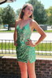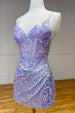 Othello. a dazzling sheath-style homecoming dress in sequin fabric. Available in Purple. Lilac. Green. and Lavender. adorned with shimmering appliques and sequins with a flattering V-neckline and sleeveless design. Complete with a lace-up back. Othello is perfect for making a statement with its shimmering elegance and vibrant hues.