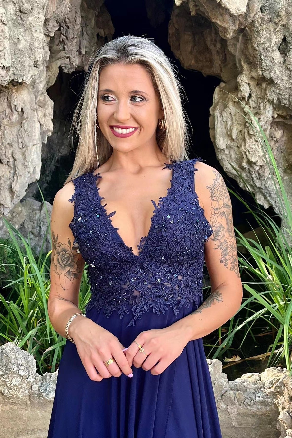 Expertly crafted and elegantly designed. this V-neck chiffon evening dress features exquisite appliques lace and a flattering. split front. Perfect for any formal occasion. this dress exudes sophistication and grace. Made with high-quality fabrics for a comfortable fit that will make you feel confident and beautiful.